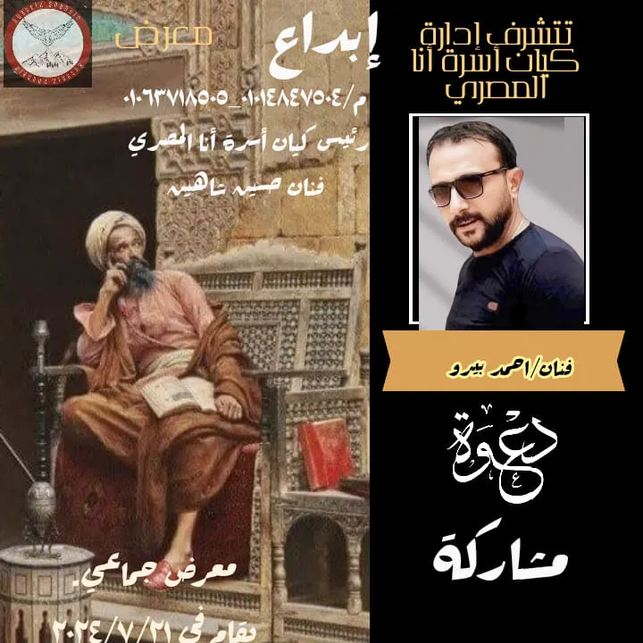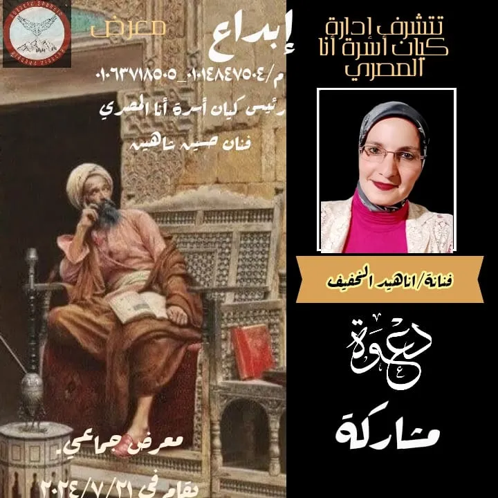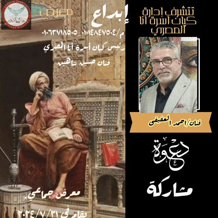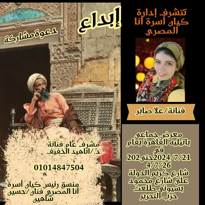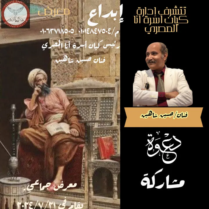 Ana Al-Masry family entity. Creativity exhibition. A group exhibition for all male and female artists. Everyone expresses and creates what he likes Head of the Ana Al-Masry family entity, artist Hussein Shaheen. From July 21, 7 pm until July 26, 9 pm
