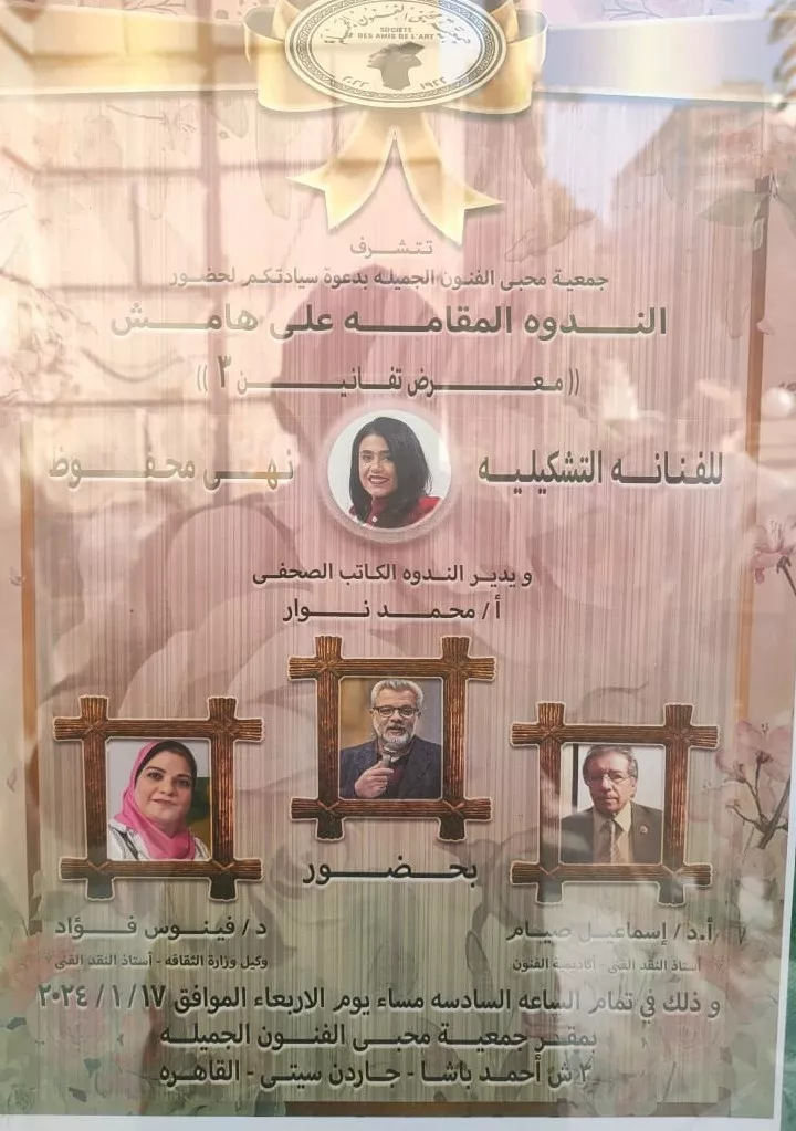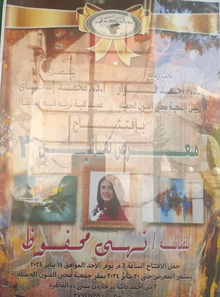 Fine Arts Lovers Association exhibition Dedication 3 By artist Noha Mahfouz Opening at 6 pm, Sunday, January 14, 2024, in the exhibition hall - Fine Arts Lovers Association - and the exhibition continues until January 20. Secretary General of the Association, Prof. Dr. Salah Al-Melegy