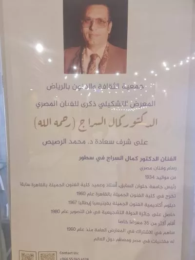 The Culture and Arts Association in Riyadh is pleased I invite you to attend the Zikra art exhibition For the artist Dr. Kamal Al-Sarraj (may God have mercy on him) In honor of His Excellency Dr. Muhammad Al-Rassis On Monday: November 13, 2023 AD, at: 8:00 PM to 10 PM In Al-Badr Hall - the association’s headquarters in Al-Ma’athar The exhibition lasts for 4 days. Contact Us: +966 55 045 4528 info_ruh@sasca.org.sa @Ruh_sasca