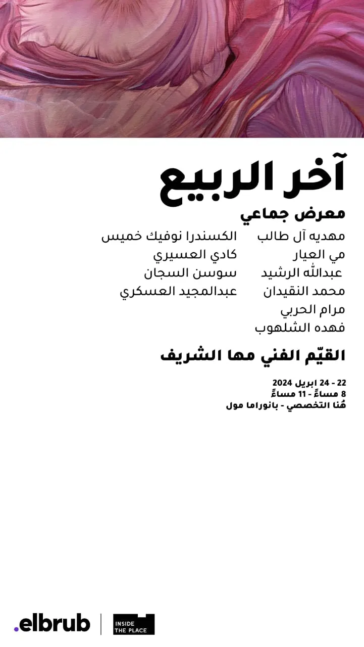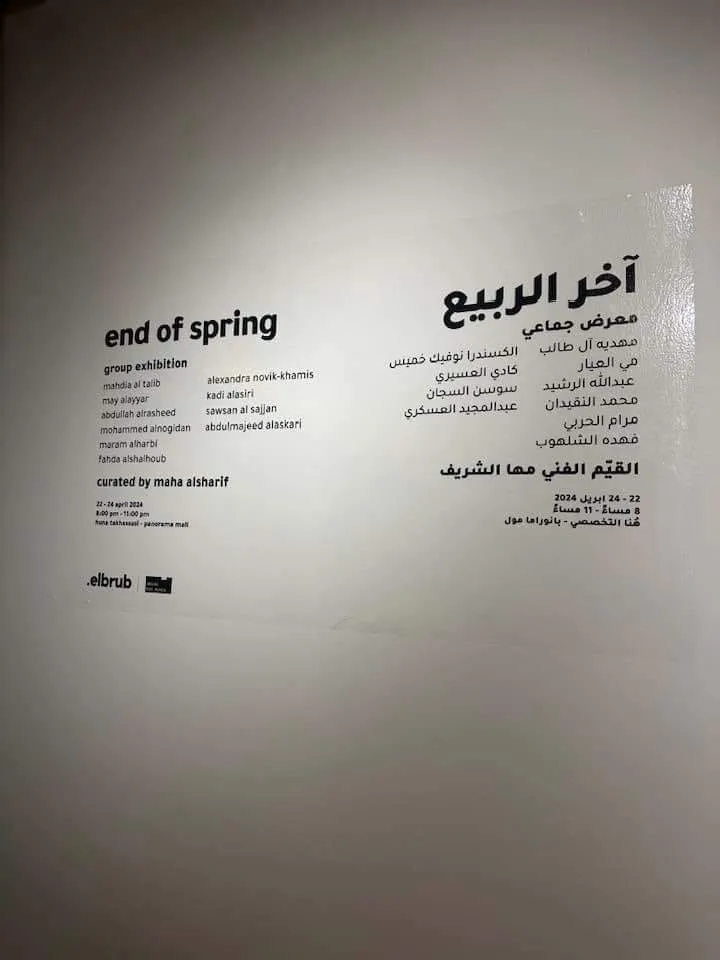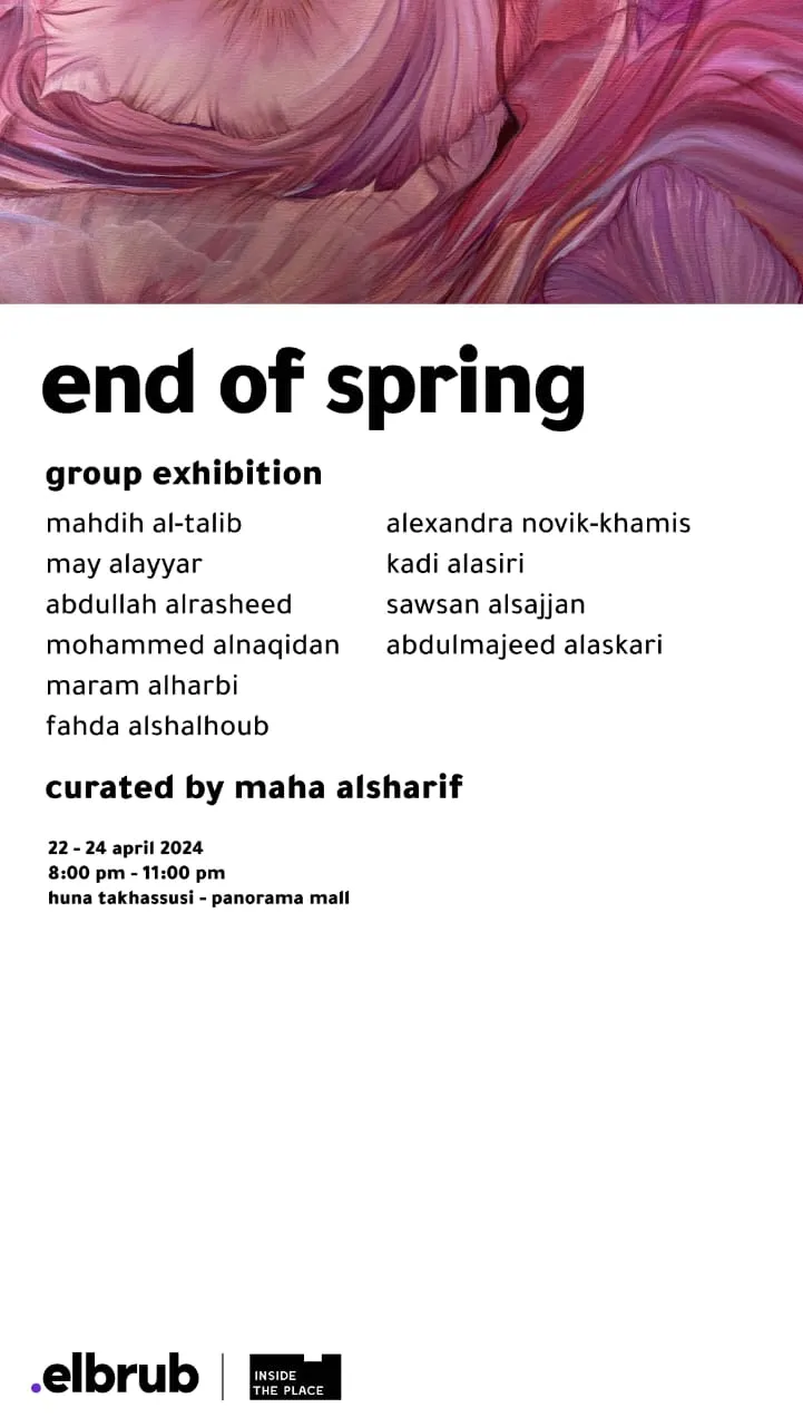 end of spring group exhibition mahdih al-talib may alayyar abdullah alrasheed mohammed alnaqidan maram alharbi fahda alshalhoub alexandra novik-khamis kadi alasiri sawsan alsajjan abdulmajeed alaskari curated by maha alsharif 22-24 april 2024 8:00 pm-11:00 pm huna takhassusi - panorama mall elbrub THE PLACE