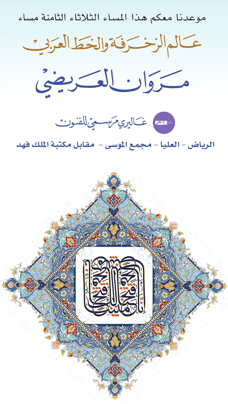 Marsami Art Gallery is honored to invite you to attend the opening of the exhibition of the Lebanese artist and expatriate artist in America, Marwan Al-Aridi, "The World of Arabic Calligraphy and Ornamentation." This exhibition will be held on Tuesday, May 20, 2025, at 8:00 PM. Riyadh, Al-Olaya General, Al-Mousa Complex, ground floor, on the main street, opposite the King Fahd National Library. The exhibition will run from May 20, 2025, to May 30, 2025.