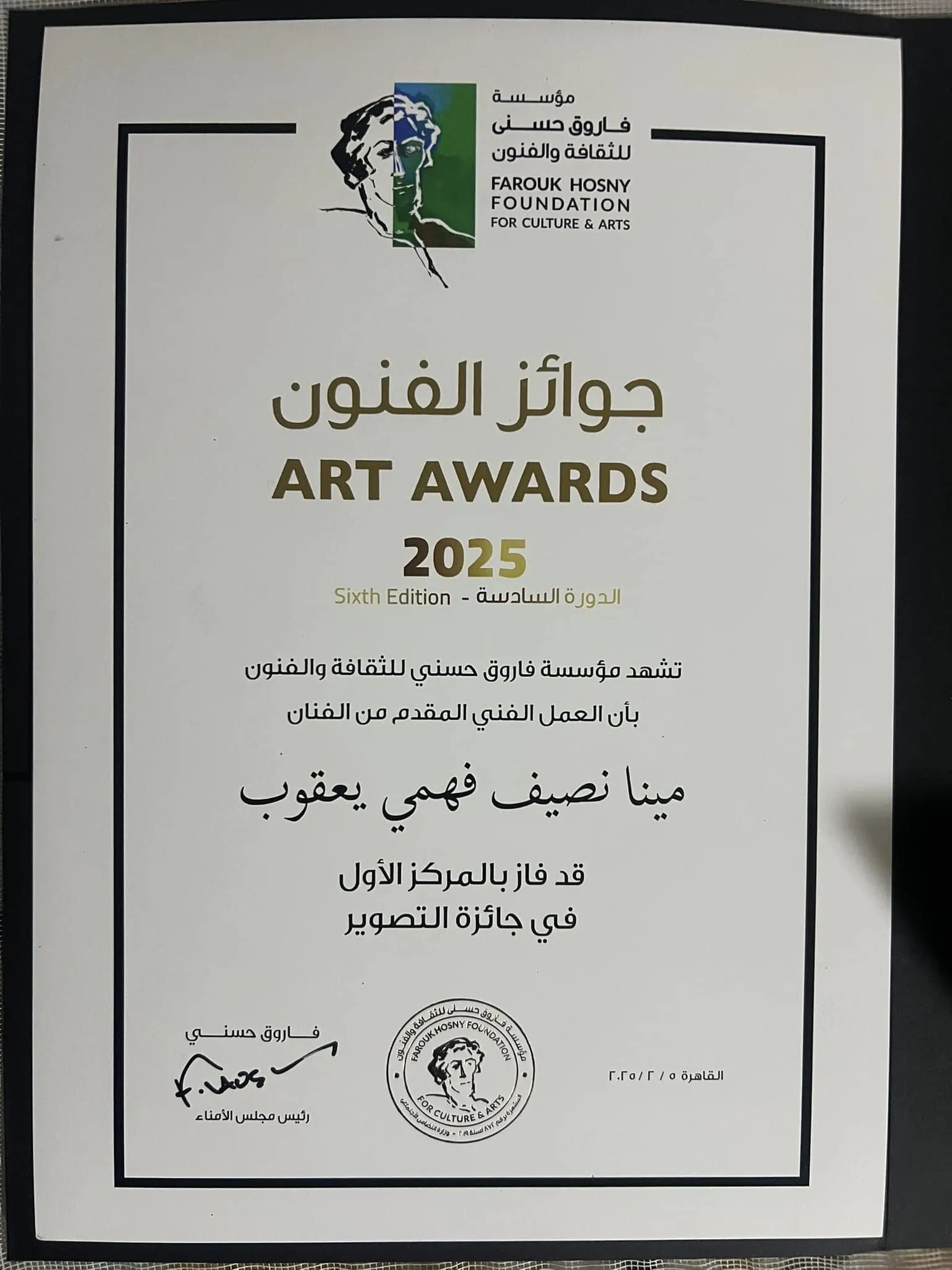Then, the artist Farouk Hosni, on behalf of the Farouk Hosni Foundation for Culture and Arts, congratulated all the winners and participants in the group exhibition of the sixth session of the Arts Awards for the year 2025, wishing them continued success and prosperity.