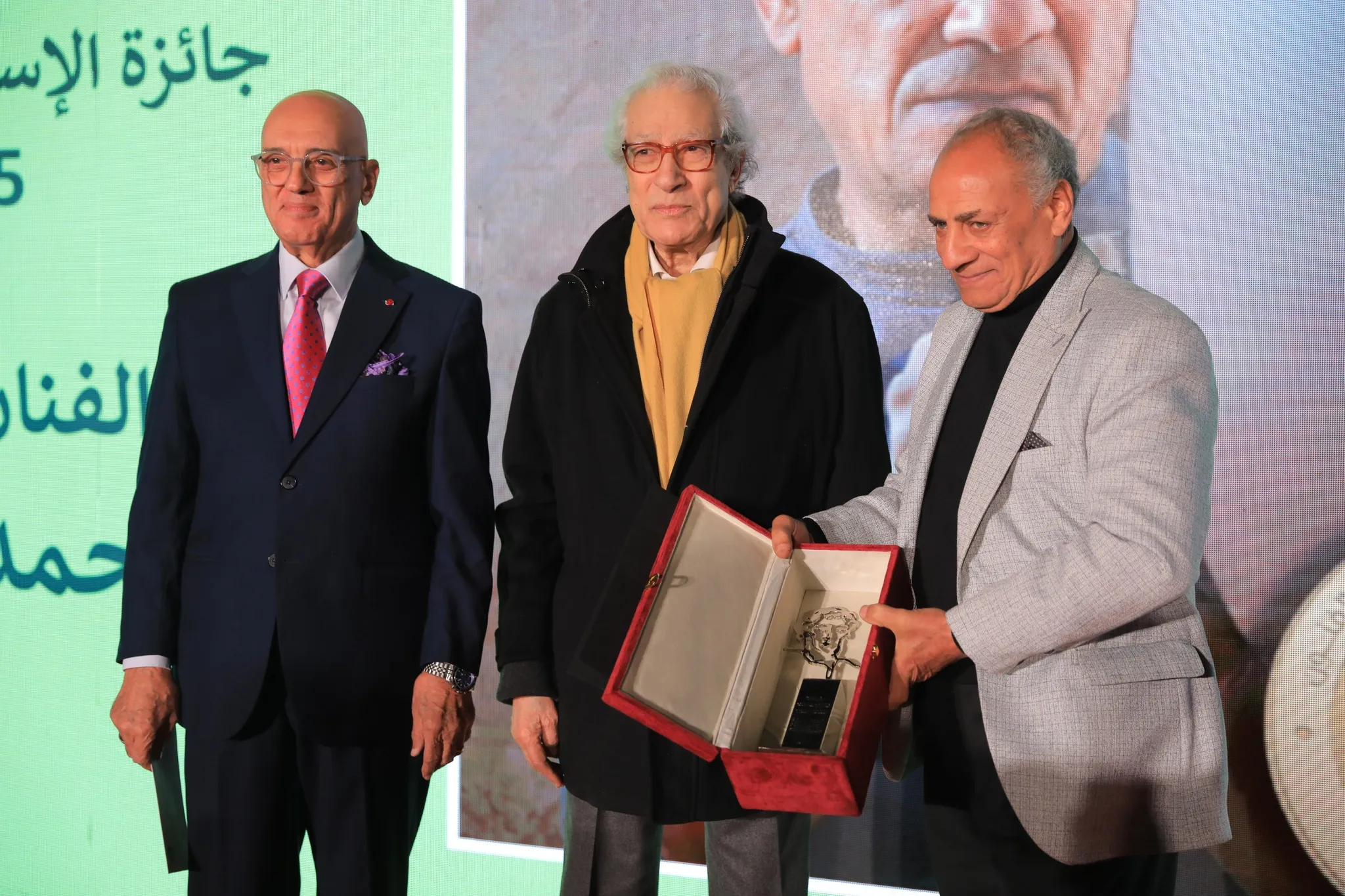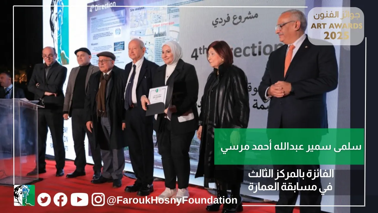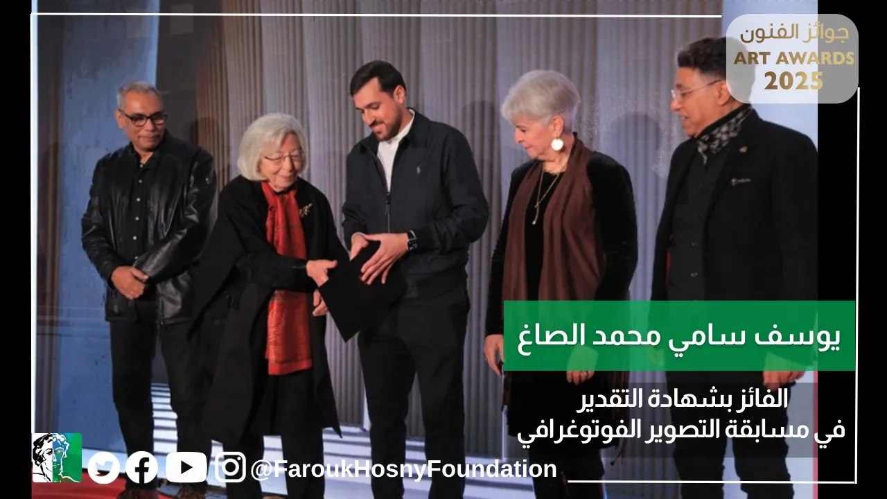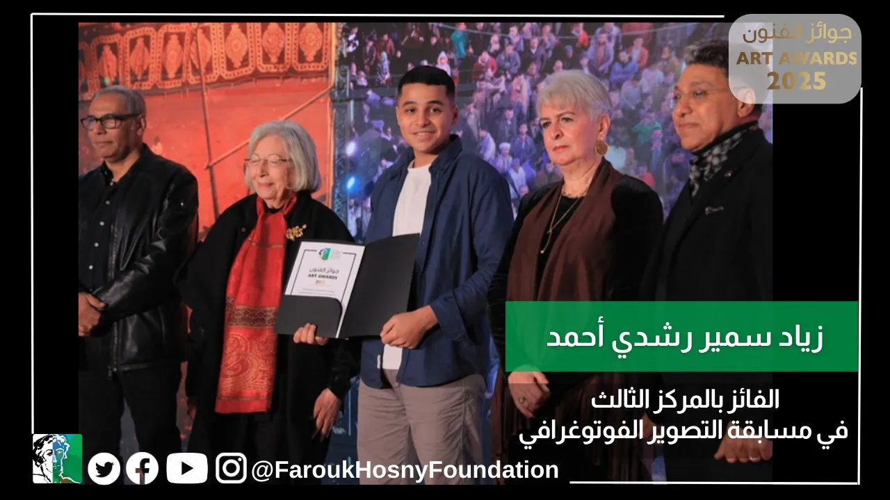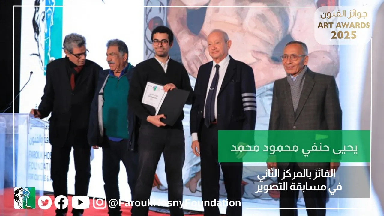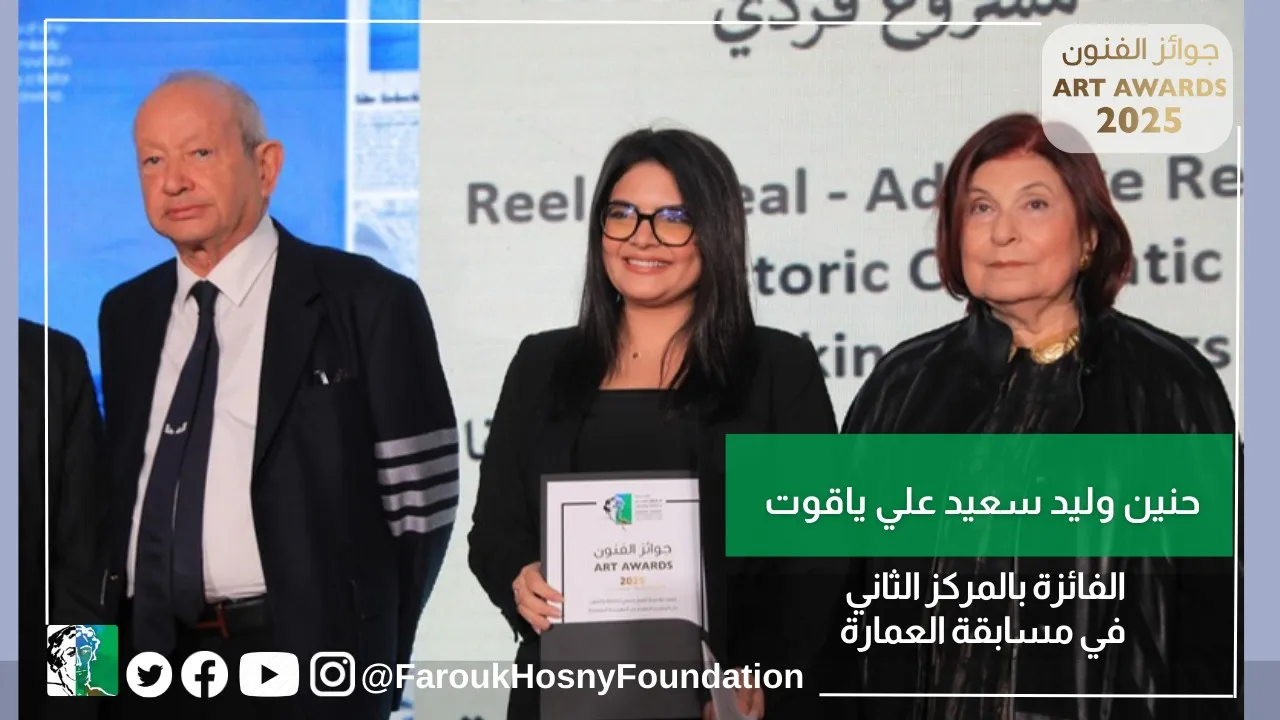 His Excellency the artist Farouk Hosni, Chairman of the Board of Trustees, and Engineer Naguib Sawiris, Vice Chairman of the Board of Trustees of the Farouk Hosni Foundation for Culture and Arts, members of the Board of Trustees, and Dr. Walid Qanush, Head of the Fine Arts Sector, inaugurated the group exhibition for youth, followed by the Arts Awards ceremony in its sixth session for the year 2025, which is held at the Gezira Arts Center, in the presence of members of the Board of Trustees of the Foundation, members of the awards judging committees, a large number of artists, critics, prominent figures, and leaders of the Ministry of Culture. Among the most prominent attendees were Dr. Zahi Hawass, the great thinker Mustafa El-Feki, Dr. Sameh Farid, former Minister of Health, the great writer / Mohamed Salmawy, Dr. Ahmed Ghoneim, Chairman of the Grand Egyptian Museum Authority, Engineer Mohamed Abu Saada, Head of the Urban Coordination Authority, Engineer Hamdi El-Satohi, Head of the Cultural Development Fund, and director Walid Aouni. Artist Farouk Hosni, Chairman of the Board of Trustees, addressed the role of the Ministry of Culture in sponsoring the Foundation’s activities, which gave it weight in the creative community. He also thanked all print and visual media outlets for their constant support of the Foundation and their interest in all the activities it provides to creative and distinguished youth, discovering them and presenting them to society. He also thanked the Board of Trustees for all their efforts in developing plans and strategies, which helped in the Foundation’s success in all the steps assigned to it. Artist Farouk Hosni also thanked the members of the arbitration committees. Engineer Naguib Sawiris, Vice Chairman of the Board of Trustees, expressed his happiness in his speech at the announcement ceremony of the Farouk Hosni Foundation for Fine Arts Awards in its sixth session, praising the distinguished artworks displayed this year. The opening of the exhibition was accompanied by a classical music concert, and the awards ceremony began, presented by the distinguished media figure Jasmine Taha Zaki, and a documentary film entitled “The Story of an Award” was shown. The arts awards, which amount to one million Egyptian pounds, were distributed as follows: