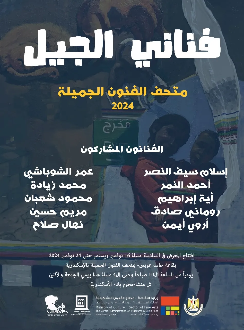 In Hamed Awis Hall Under the patronage of Prof. Dr. Ahmed Fouad Hano, Minister of Culture, Prof. Dr. Walid Qanoush, Head of the Fine Arts Sector, will open the group exhibition (Generation Artists) on Saturday, November 16, 2024, at 6 pm, in Hamed Awis Hall, at the Museum of Fine Arts in Alexandria.
