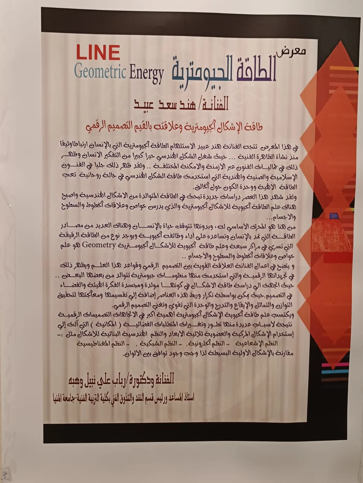 Geometric Energy 2024 By the artist / Hind Saad Mohamed Obaid Assistant Professor of Design, Department of Decorative Designs, Faculty of Art Education - Minya University The exhibition opens on Saturday, August 3, 2024, at 7:00 pm in the (Adam Hanin) Hall at the Hangar Arts Center, Cairo Opera House Square. The exhibition continues until August 8, 2024, from 10:00 am to 9:00 pm. I am also honored to invite you to attend the opening