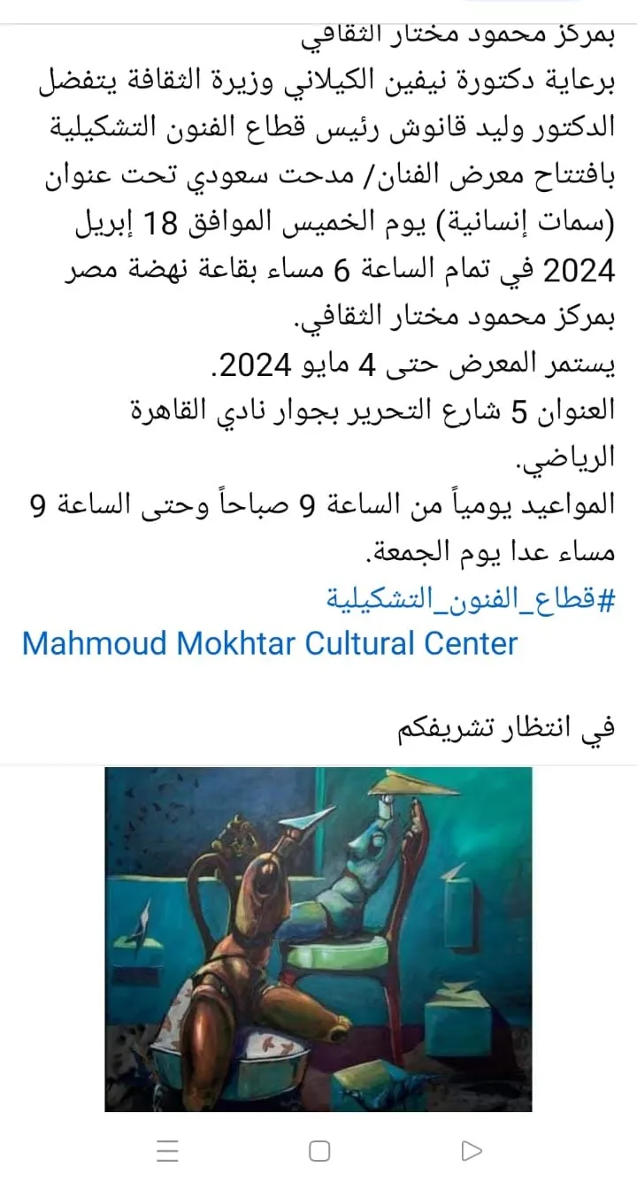 At Mahmoud Mukhtar Cultural Center Under the patronage of Dr. Nevin Al-Kilani, Minister of Culture, Dr. Walid Qanoush, Head of the Fine Arts Sector, kindly opened the artist / Medhat Saudi exhibition under the title Human Traits on Thursday, April 18, 2024, at 6 pm in Nahdet Misr Hall. At Mahmoud Mukhtar Cultural Center. The exhibition continues until May 4, 2024. Address: 5 Tahrir Street, next to Cairo Club The athlete. Appointments are daily from 9 am to 9 pm Evening except Friday. #Fine_Arts_Sector Mahmoud Mokhtar Cultural Center Waiting to honor you