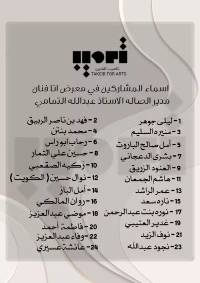 Names of the participants in the “I Am an Artist” exhibition, Director of the Gallery, Mr. Abdullah Al-Tamami 1 - Laila Johar 2- Fahd bin Nasser Al-Rubaiq 3- Munirah Al-Saleem 4- Muhammad Benten 5- Amal Saleh Al-Barout 6- Rehab Aburas 7- Bushra Al-Dajani 8 - Hussein Ali Al-Tamar 9 - Al-Anoud Al-Zariq 10 - Zakia Al-Saqabi 11 - Hashem Al-Jamaan 12 - Nawal Hussein (Kuwait) 13 - Omar Al-Rashed 14 - Amal Al-Baz 15- Narah Saad 16 - Rawan Al-Maliki 17 - Noura bint Abdul Rahman 18 - Modi Abdel Aziz 19 - Ghadeer Al-Otaibi 20 - Fatima Ahmed 21 - Nouf Al-Zaid 22 - Wafa Abdel Aziz 23- Nujoud Abdullah 24 - Aisha Asiri