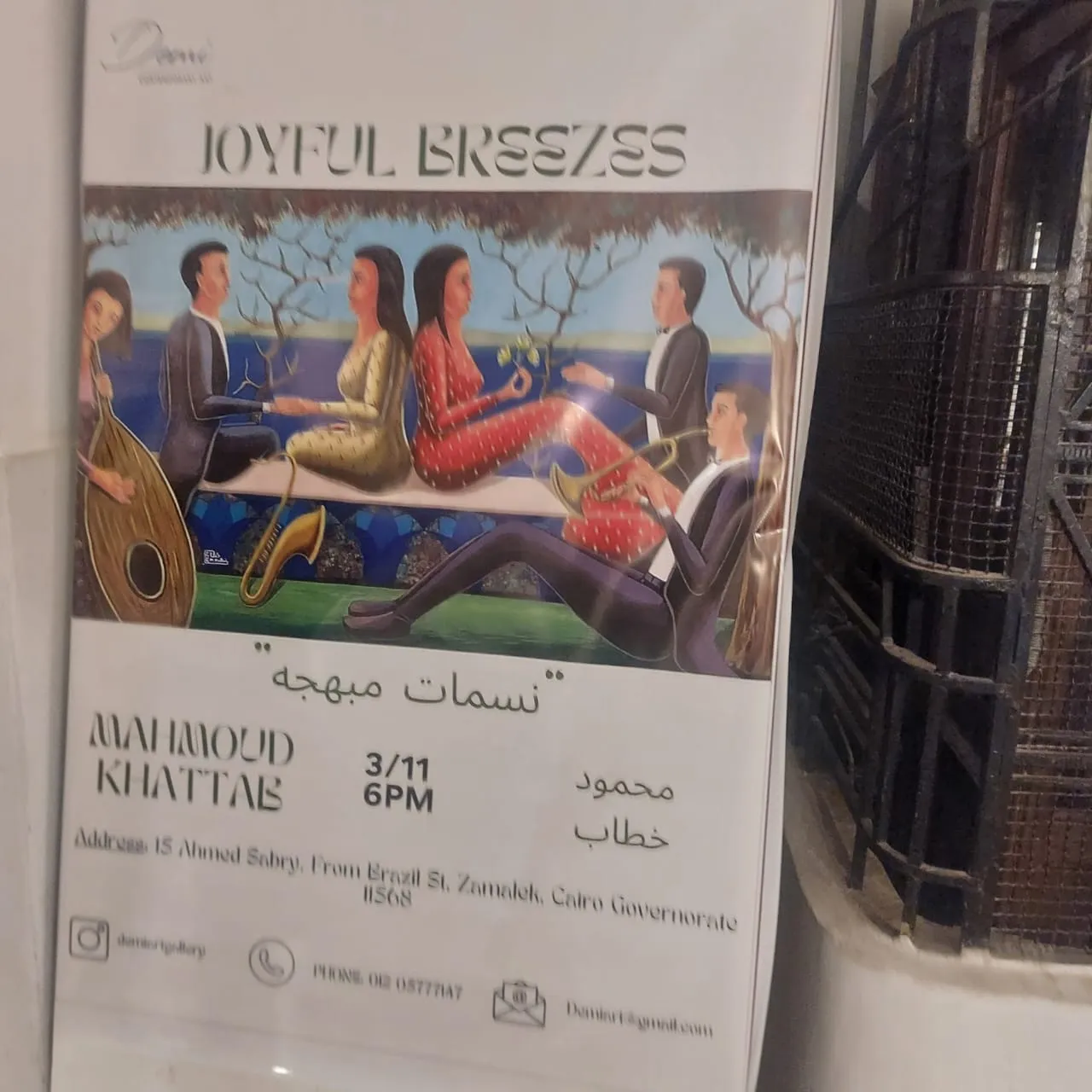 Demi CONTEMPORARTJOYFUL BREEZES3/11 6PMMahmoudKhattabAddress: 15 Ahmed Sabry. From Brazil St. Zamalek. Cairo Governorate 11568demiartgalleryPHONE: 012 05777147Demiart@gmail.com
