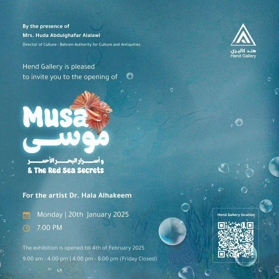and the Secrets of the Red Sea by the artist Dr. Hala Al-Hakim Monday | January 20, 2025 7:00 PM The exhibition remains open until February 4, 2025 ) 4:00 PM - 8:00 PM (Friday closed 9:00 AM - 1:00 PM Hend Gallery website