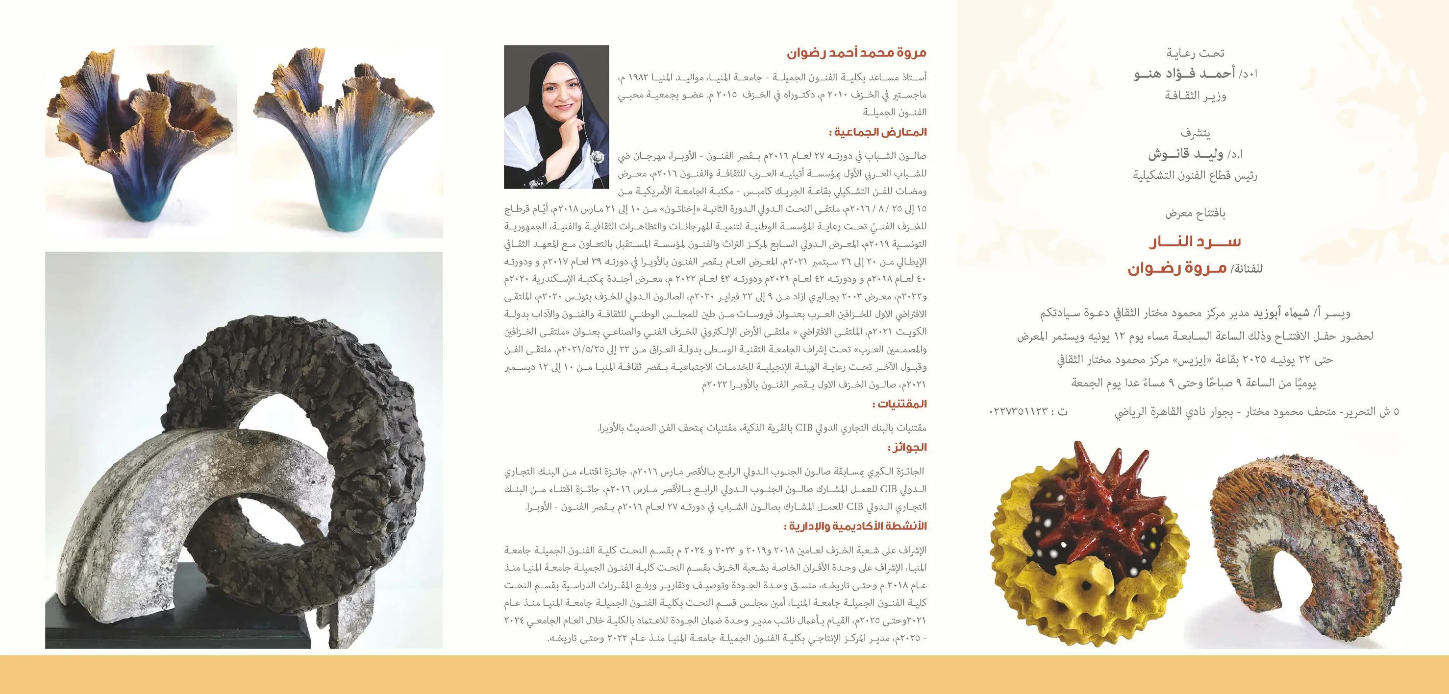 Watch the opening of the "Narration of Fire" exhibition by artist Marwa Radwan in the Isis Hall at the Mahmoud Mokhtar Cultural Center, in the presence of Dr. Ihab Al-Asyouti on Thursday, June 12, 2025. The exhibition will continue until June 22, 2025. Don't miss the opportunity to see the exhibition. Free entry. Timetable: Daily from 9 AM to 9 PM, except Fridays. Address: 5 Tahrir Street, next to the Cairo Sporting Club. Tel: 0227351123 #Visual_Arts_Sector