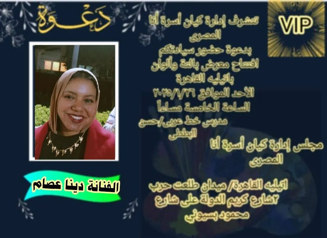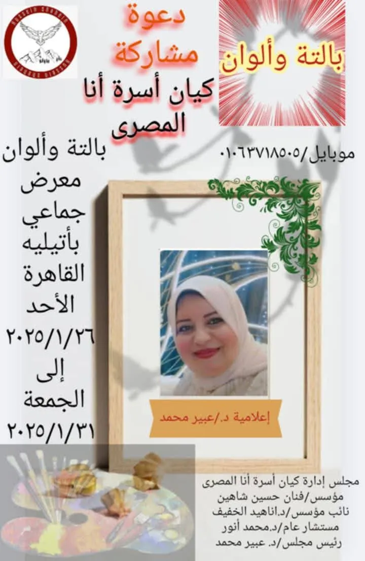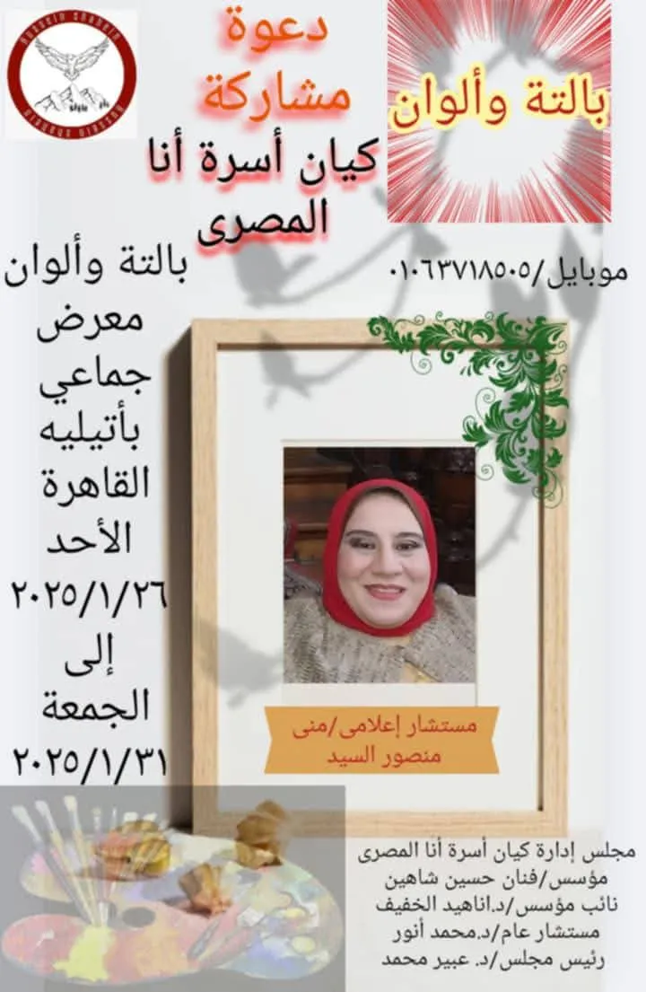 Ana El Masry Family Entity Invites you to participate Palette and Colors Exhibition Chairman of the Board of Directors of Ana El Masry Family Entity Dr. Abeer Mohamed General Advisor of Ana El Masry Family Entity Dr. Mohamed Anwar Palette and Colors Cairo Atelier Sunday 1/26/2025 To Friday 1/31/2025 The Board of Directors of Ana El Masry Family Entity is pleased to invite you to attend and participate