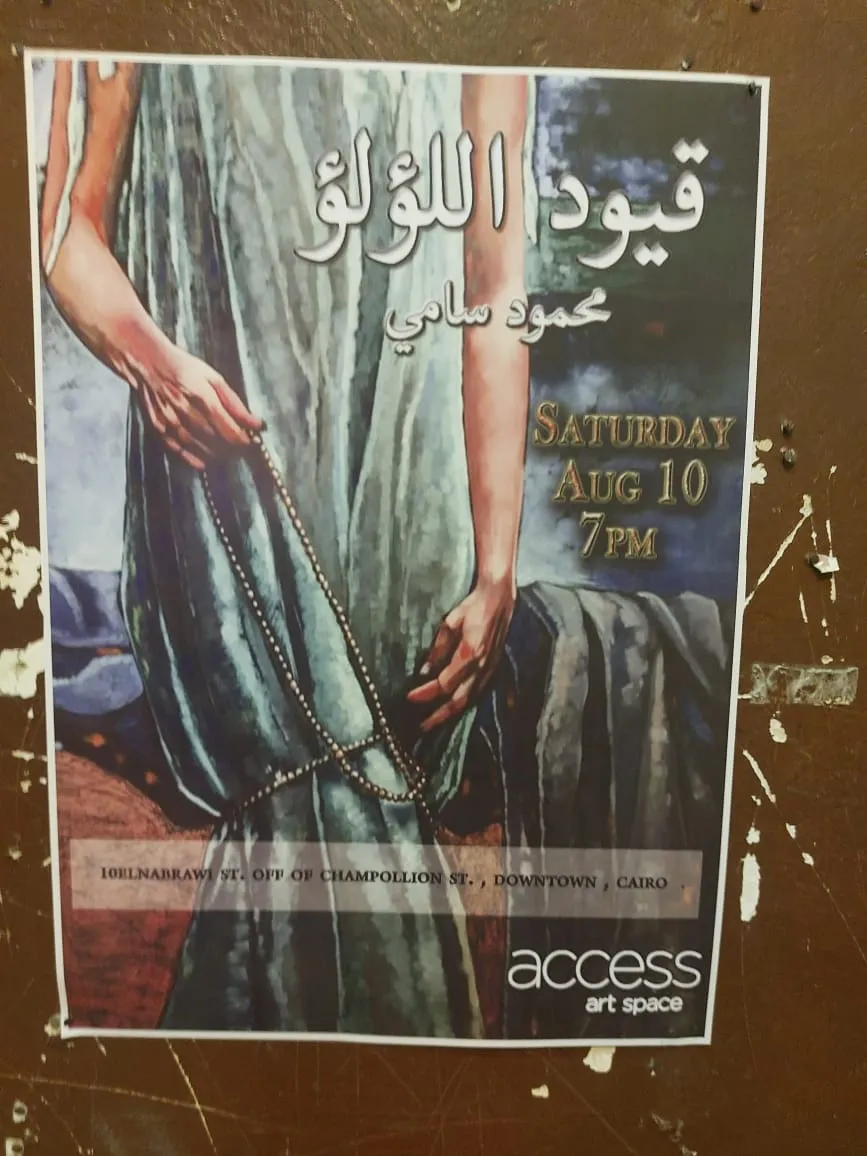 - " Pearl chains "A Solo Exhibition by Mahmoud Samy Opening night: 10th August at 7 pm. The exhibition is open daily at Access Gallery from 12 pm to 9 pm, except on Thursdays and Fridays . 10 El Nabrawy Street, off Champollion Street, Downtown Cairo, Egypt