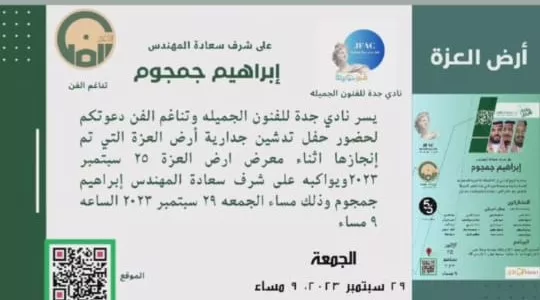 In honor of His Excellency Eng Ibrahim Jamjoom On the occasion of the 93rd National Day of our beloved Kingdom of Saudi Arabia, we are honored and pleased by your presence to open an exhibition Pride Lands The exhibition, which includes 30 male and female artists, is accompanied by a workshop to produce a huge collective mural for 5 days, God willing. 9 pm Monday, September 25th