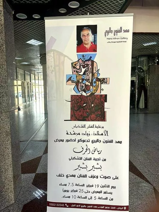 Cradle of Arts Gallery Mohd Alfnan Gallery Sponsored by the visual artist Professor: Ziad candidate Cradle of Arts Gallery invites you to attend an exhibition Riad Al Harf From the experience of the visual artist Bashir Bashir With the voice and playing of artist Mahdi Khalaf Monday, February 19 at 7.5 pm The exhibition continues until February 25, daily from 5 to 10 pm. Riyadh - Olaya - Al-Mousa Complex, Cradle of Arts Gallery, first floor 0502132245