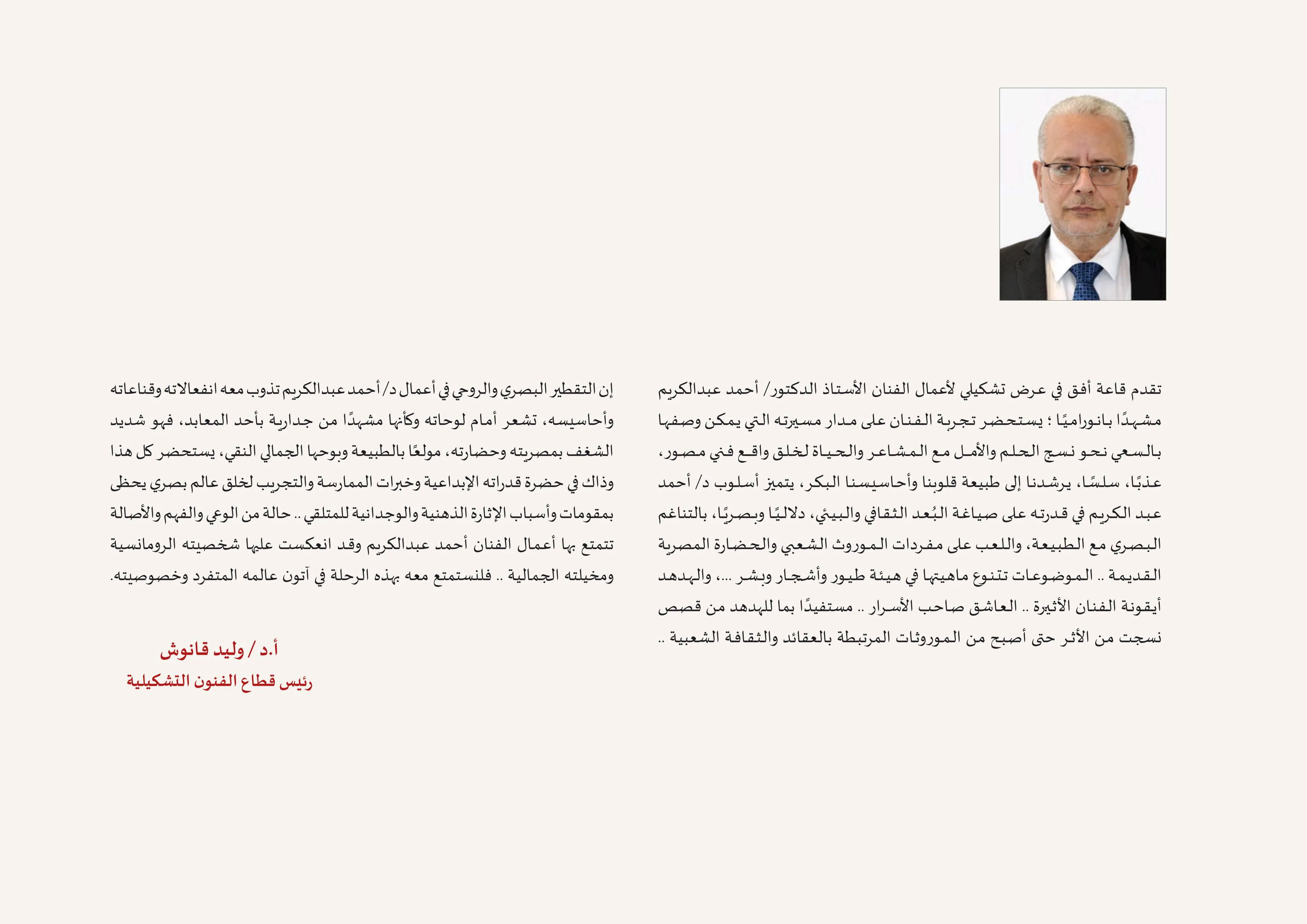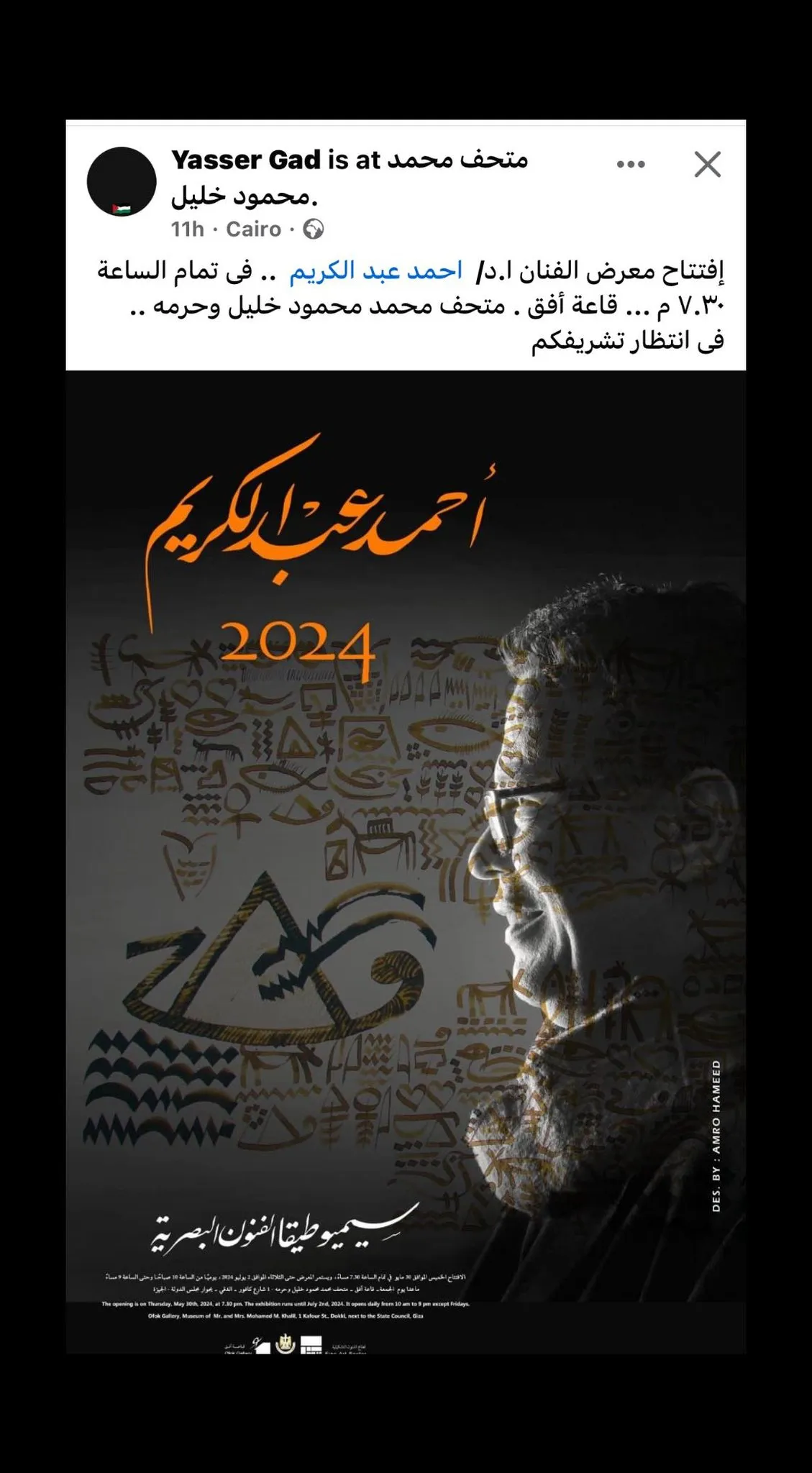 Our date is Thursday, May 30, 2024 With the great artist/ Ahmed Abdel Karim in Ofoq 1 Hall and his new exhibition (Semiotics of Visual Arts). The exhibition is kindly opened by Prof. Dr. Walid Qanoush, Head of the Fine Arts Sector, at 7:30 pm in Ofoq 1 Hall in the Mohamed Mahmoud Khalil Museum and its campus. The exhibition runs until July 2, 2024. This is sponsored by Prof. Dr. Nevin Al-Kilani, Minister of Culture. Address: 1 Cavour Street, next to the State Council Waiting to honor you. #Fine_Arts_Sector