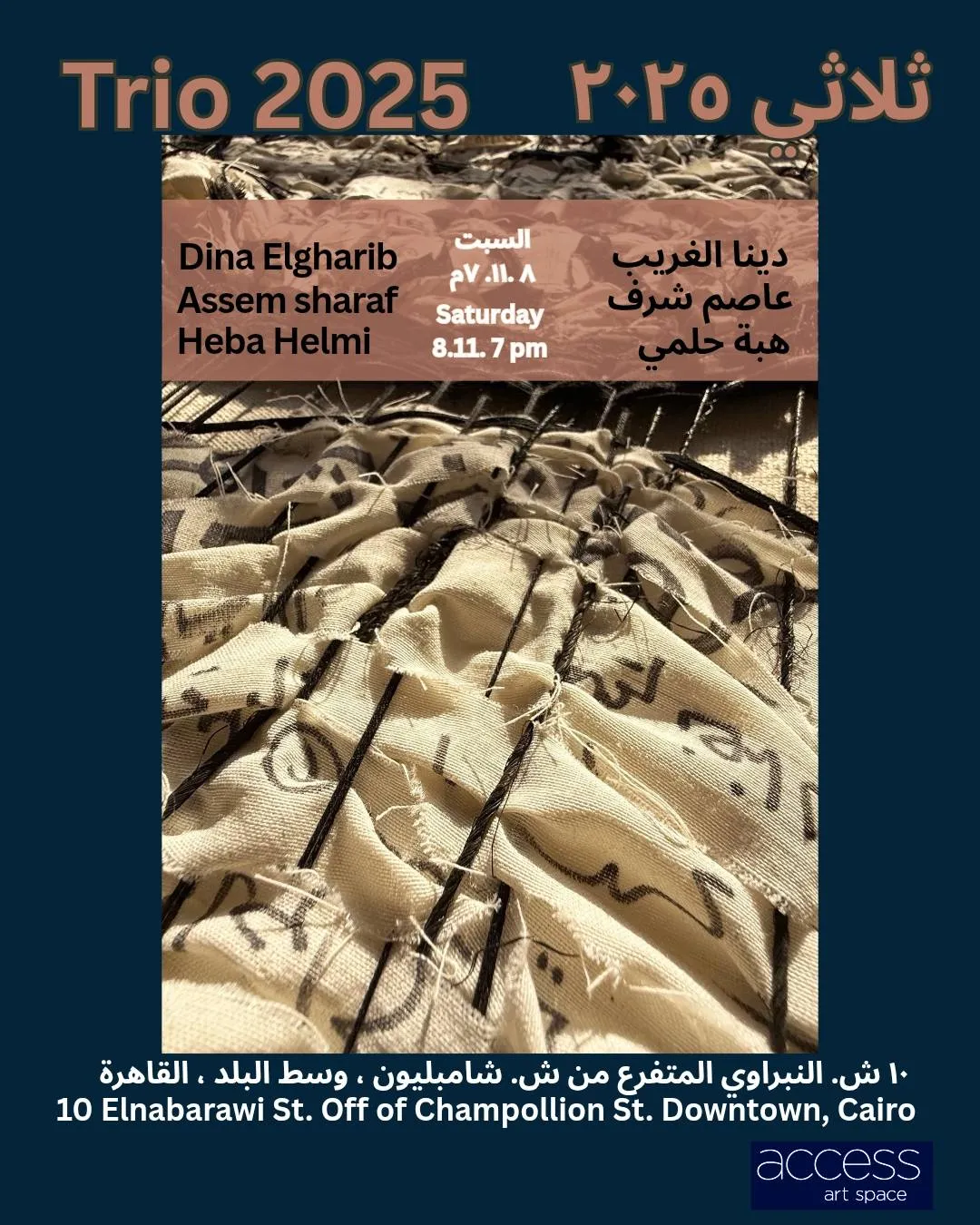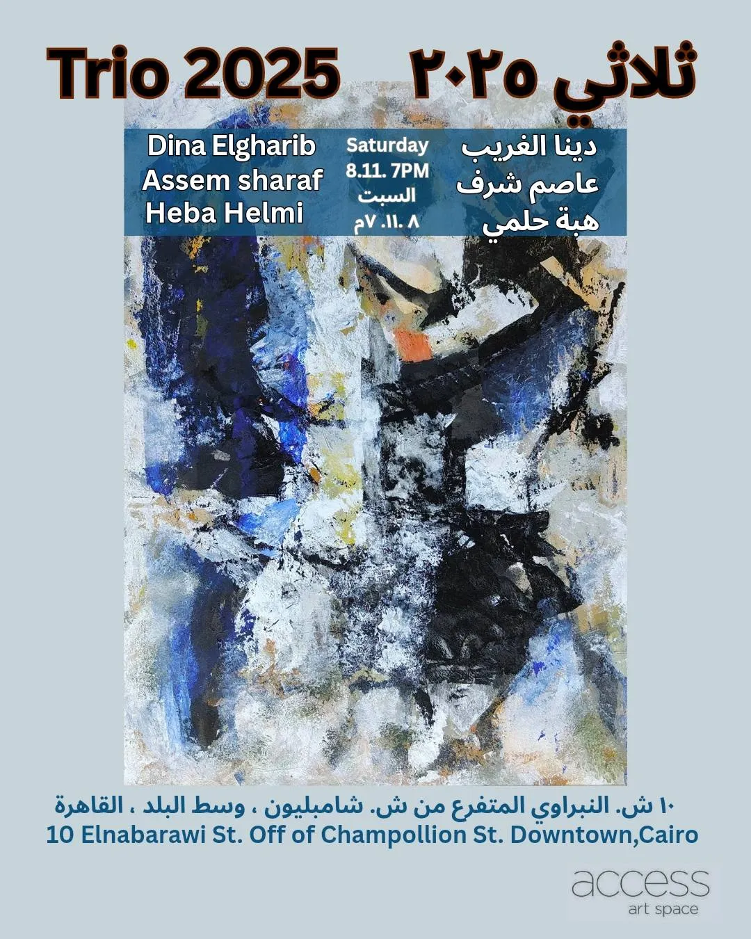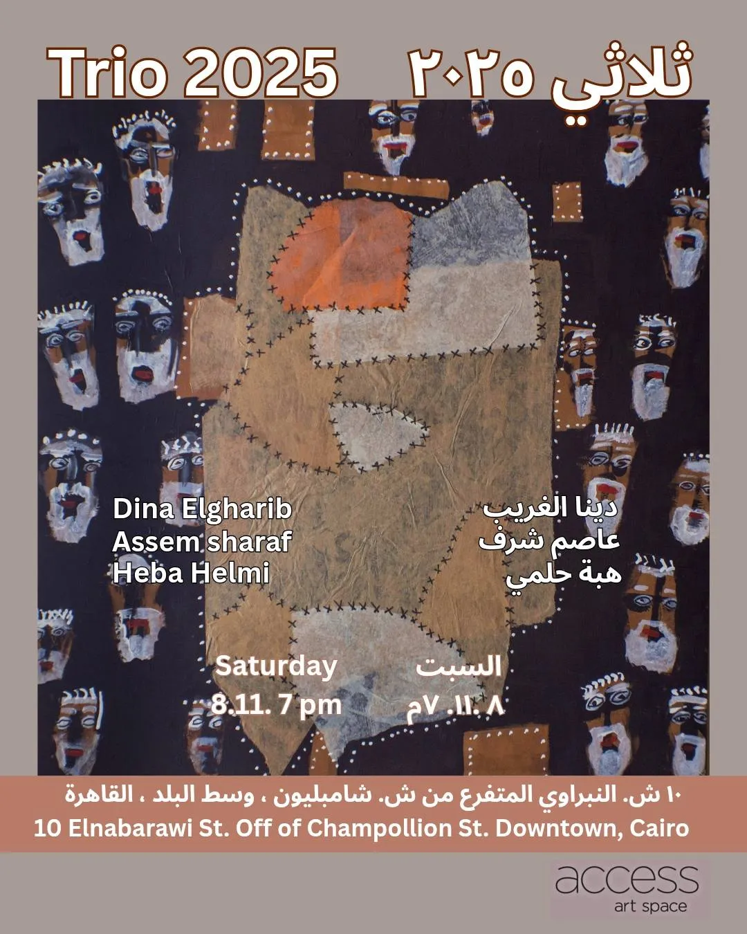 Access Artspace invites you to the opening of " TRIO 2025 " Dina El Gharib - Assem Sharaf - Heba Helmi Three distinguished Egyptian artists whose creative journeys span painting , calligraphy, and mixed media reunite for their second trio exhibition of 2025. The exhibition is dedicated to Gaza , reflecting the artists' shared emotional and human response to its ongoing struggle . Through Helmi's expressive calligraphic works , El Gharib's evocative collages , and Sharaf's powerful figurative paintings , the show creates a visual dialogue of resilience, loss and hope An art event that carries a message from the heart of humanity . Date : Saturday , November 8th, 2025 time : 7:00 PM location : 10 Elnabarawi St. Off of Champollion St. downtown,cairo
