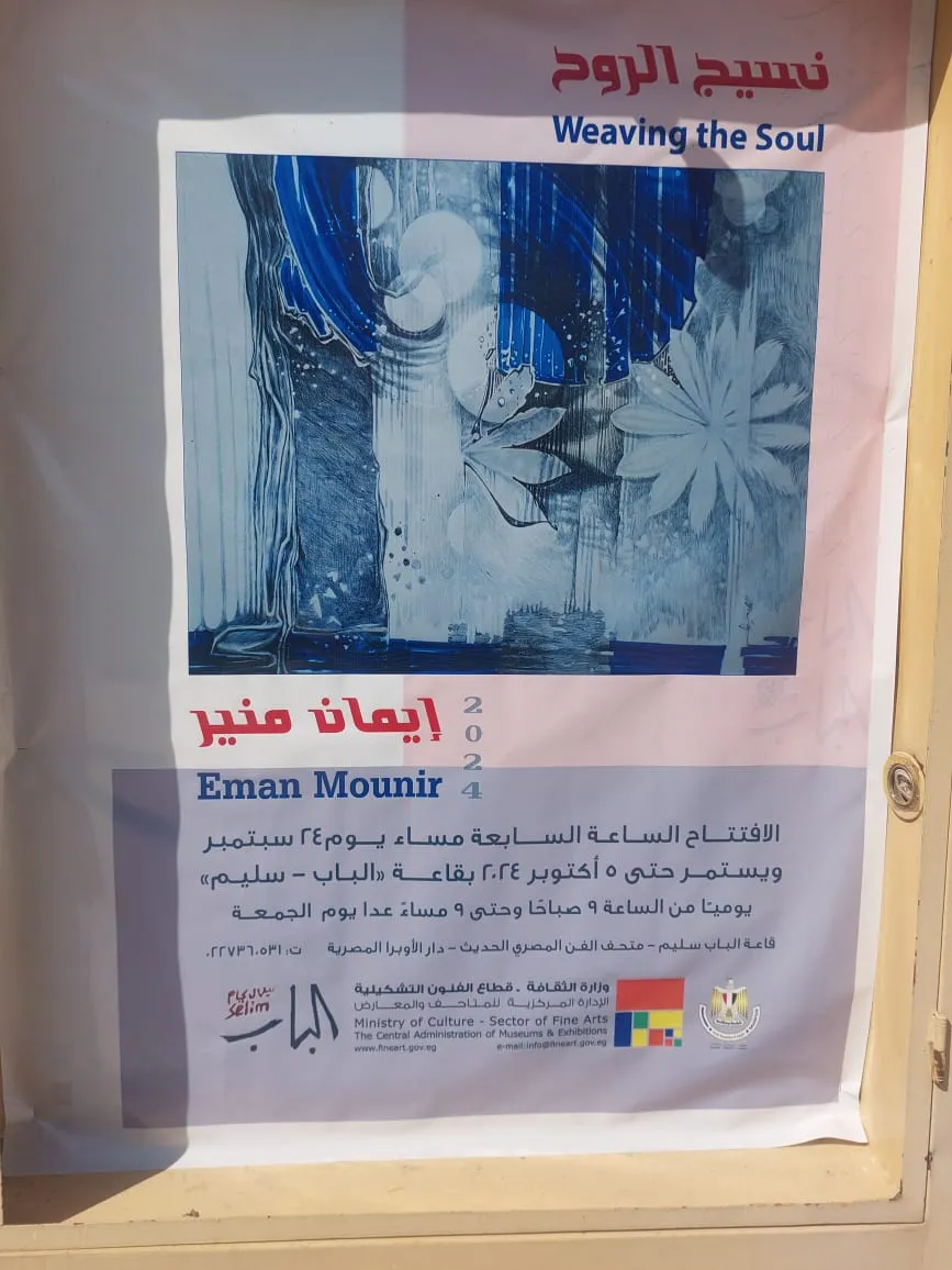At Bab Hall Prof. Dr. Walid Qanush, Head of the Fine Arts Sector, opened the "Fabric of the Soul" exhibition by artist Iman Mounir on Tuesday 9/24/2024 at Bab Hall. The opening was attended by Prof. Dr. Hamdi Abu Al-Maati, Prof. Dr. Ashraf Reda, Prof. Dr. Salah Al-Meligy, Prof. Dr. Safia Al-Qabbani, Dr. Ihab Kashkosha and a group of fine artists. The exhibition continues until 10/5/2024. Timings: Daily from 9 am to 9 pm except Friday. Address: Bab Selim Hall - Museum of Modern Egyptian Art, Cairo Opera House. T: 0227360531