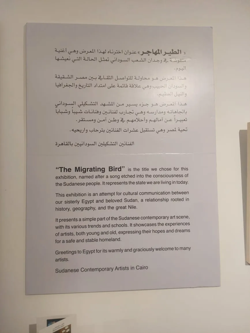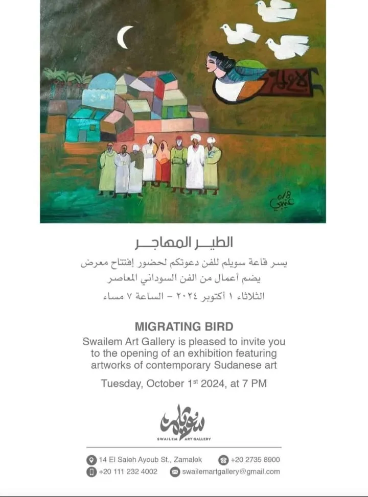 It is a pleasure to invite you to attend the opening of an exhibition featuring works of contemporary Sudanese art The Migratory Bird Tuesday, October 1, 2024 - 7 pm Participants by age Hussein Sharif Mohammed Omar Khalil Sharif Matar Ahmed Abdel Aal Haider Idris Ibrahim Mohammed Abdullah Otaibi Hassan Ali Ahmed Adel Kabida Kamal Hashim Faisal Taj Al-Sir Awatif Ali Mahjoub Osama Al-Junaid Al-Tayeb Do Al-Bayt Alaa El-Din Abdel Razak Maj Di Adam Mohammed Abdel Wahab Atef Wad Al-Hajj Laila Adam Munim Hamza Al-Naaman Fares Sara Asim Najat Al-Mahi Hala Nour El-Din Omar Kamal Suzan Ibrahim Mahjoub Khaled Mohammed Ali Randais Tariq Kamal Abada Jaber Sabah Jabara