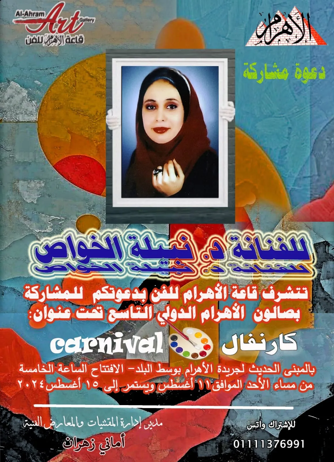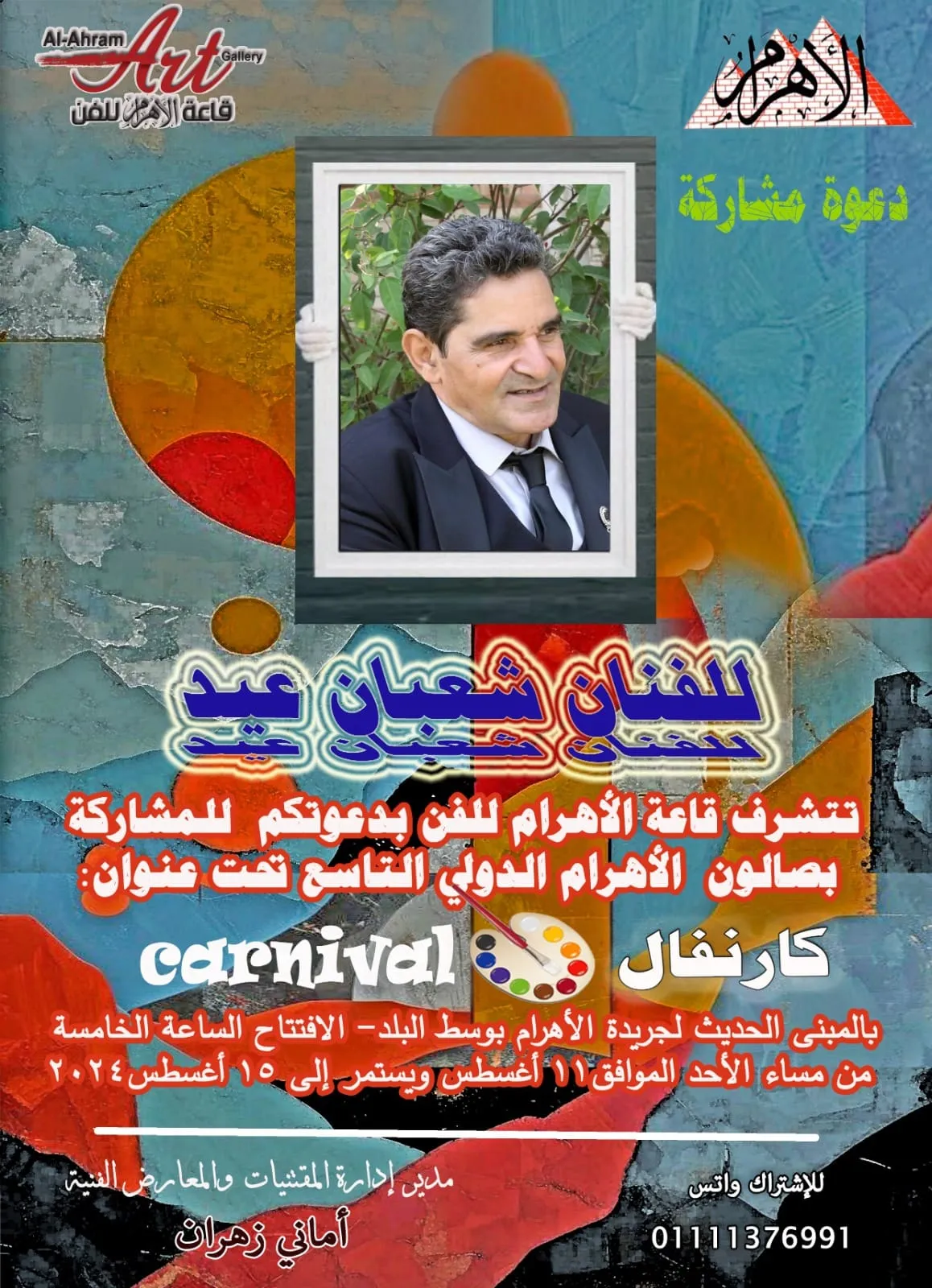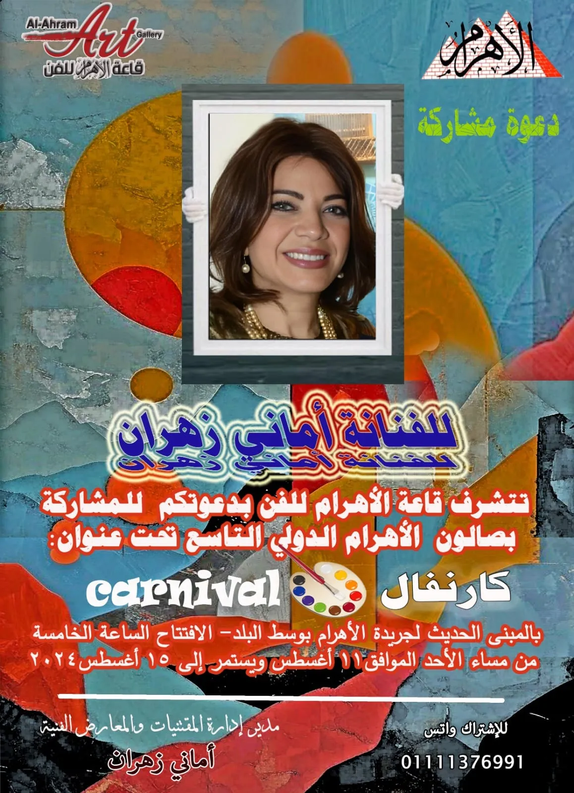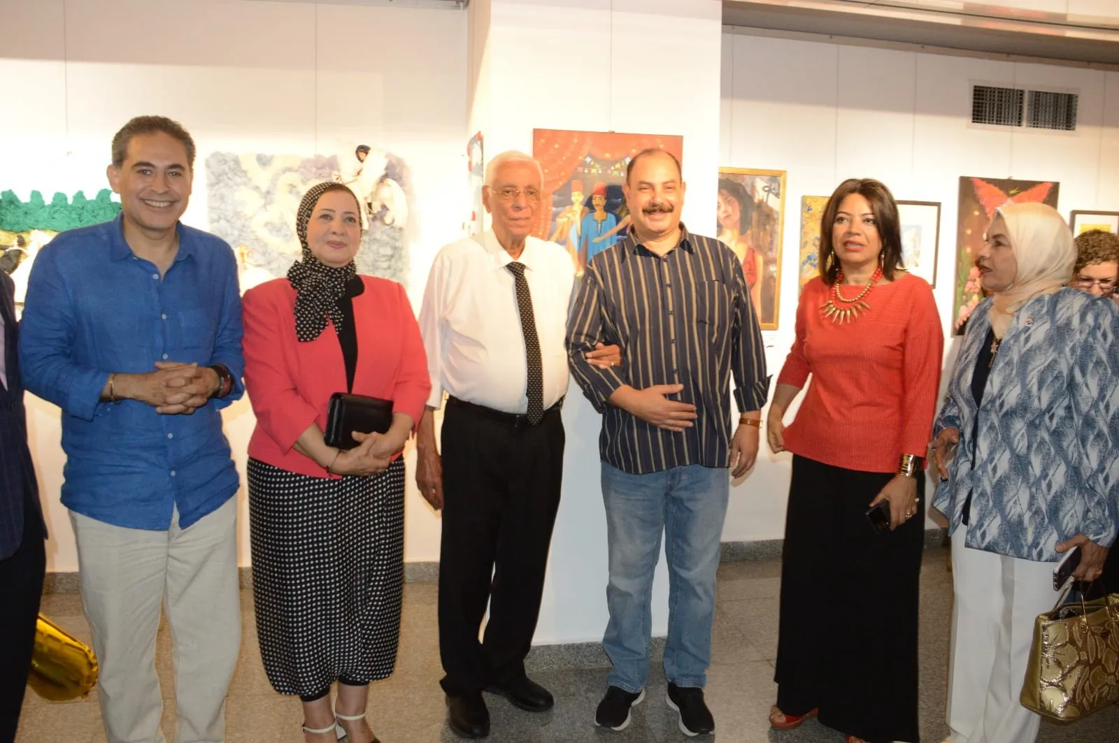 Dr. Hossam Mowafy, Professor of Critical Care Medicine at Kasr El Ainy, Mr. Ahmed Aql, Executive Director of Americana Communications, journalist Ms. Fatima Abu Hatab, Deputy Governor of the Rotary District, and Prof. Ashraf Fathy, Professor of Design and Decoration at the Faculty of Education, Suez Canal University, inaugurated the 9th Al-Ahram International Salon under the title "Carnival" at the Al-Ahram Art Hall at Al-Ahram Foundation. Artist Amani Zahran, Director of the Acquisitions and Art Exhibitions Department and the exhibition commissioner, stated that the carnival is a wonderful color show of various art schools for a group of about 80 artists, both professionals and amateurs, adults, youth and children, from all governorates of Egypt, with Arab participation by a group of brilliant artists, who represented their countries in this artistic event. The exhibition will extend until next Thursday with live art workshops by artists Mohamed Abdel Jalil and Reda Awad, and an art seminar by Dr. Sami El Balshy on art therapy and how to read and produce an artwork, and Dr. Nabila El Khawas on the effect of hot colors on artwork.