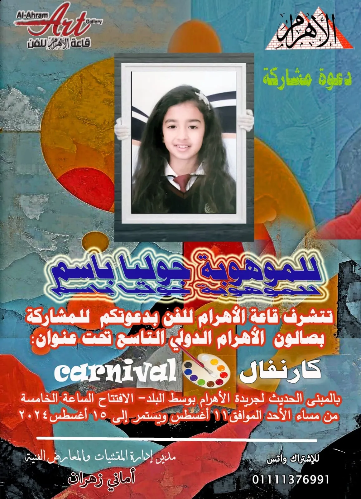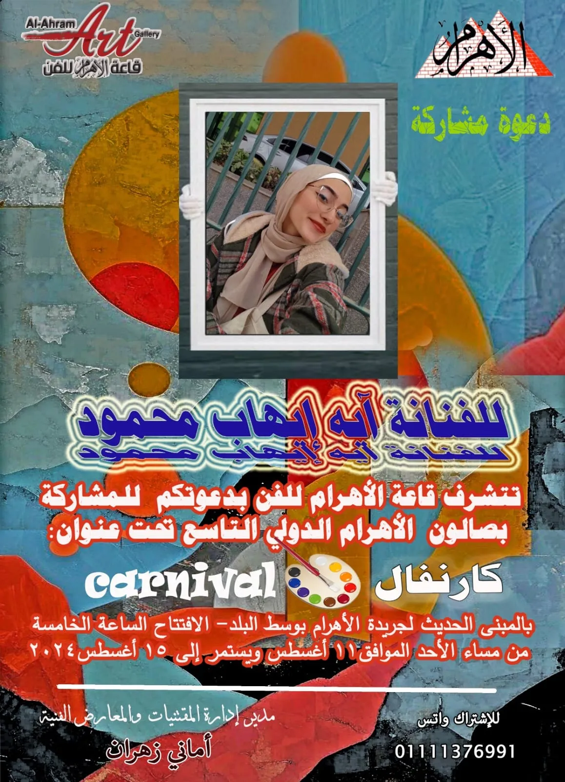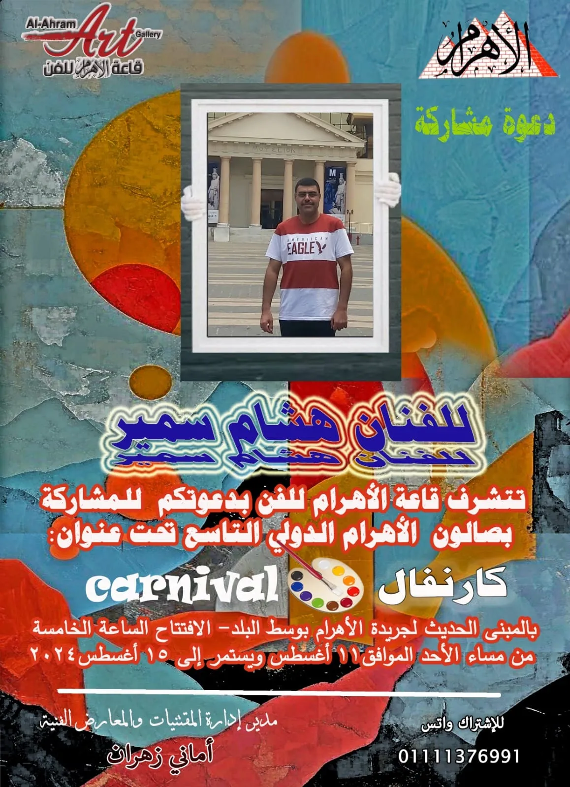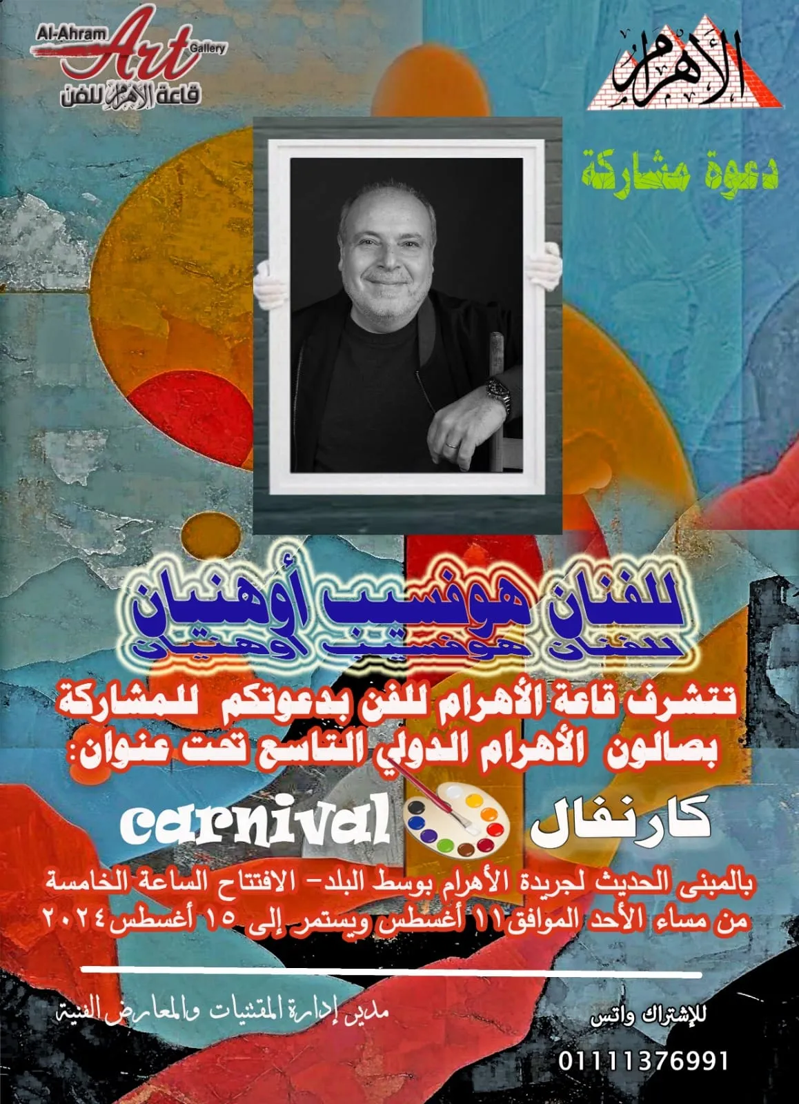 Dr. Hossam Mowafy, Professor of Critical Care Medicine at Kasr El Ainy, Mr. Ahmed Aql, Executive Director of Americana Communications, journalist Ms. Fatima Abu Hatab, Deputy Governor of the Rotary District, and Prof. Ashraf Fathy, Professor of Design and Decoration at the Faculty of Education, Suez Canal University, inaugurated the 9th Al-Ahram International Salon under the title "Carnival" at the Al-Ahram Art Hall at Al-Ahram Foundation. Artist Amani Zahran, Director of the Acquisitions and Art Exhibitions Department and the exhibition commissioner, stated that the carnival is a wonderful color show of various art schools for a group of about 80 artists, both professionals and amateurs, adults, youth and children, from all governorates of Egypt, with Arab participation by a group of brilliant artists, who represented their countries in this artistic event. The exhibition will extend until next Thursday with live art workshops by artists Mohamed Abdel Jalil and Reda Awad, and an art seminar by Dr. Sami El Balshy on art therapy and how to read and produce an artwork, and Dr. Nabila El Khawas on the effect of hot colors on artwork.