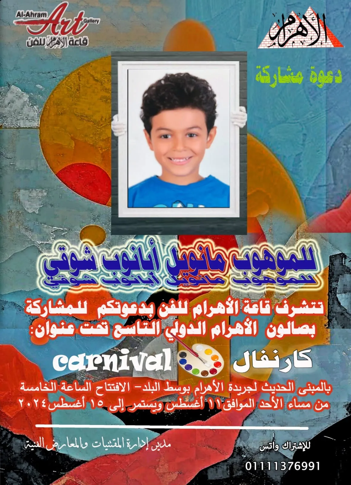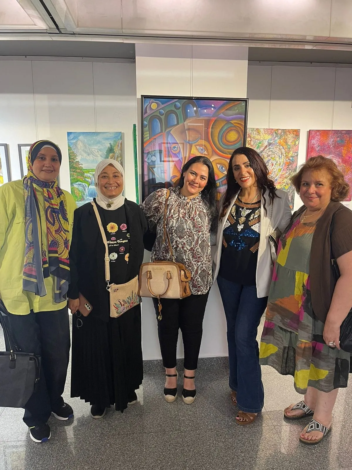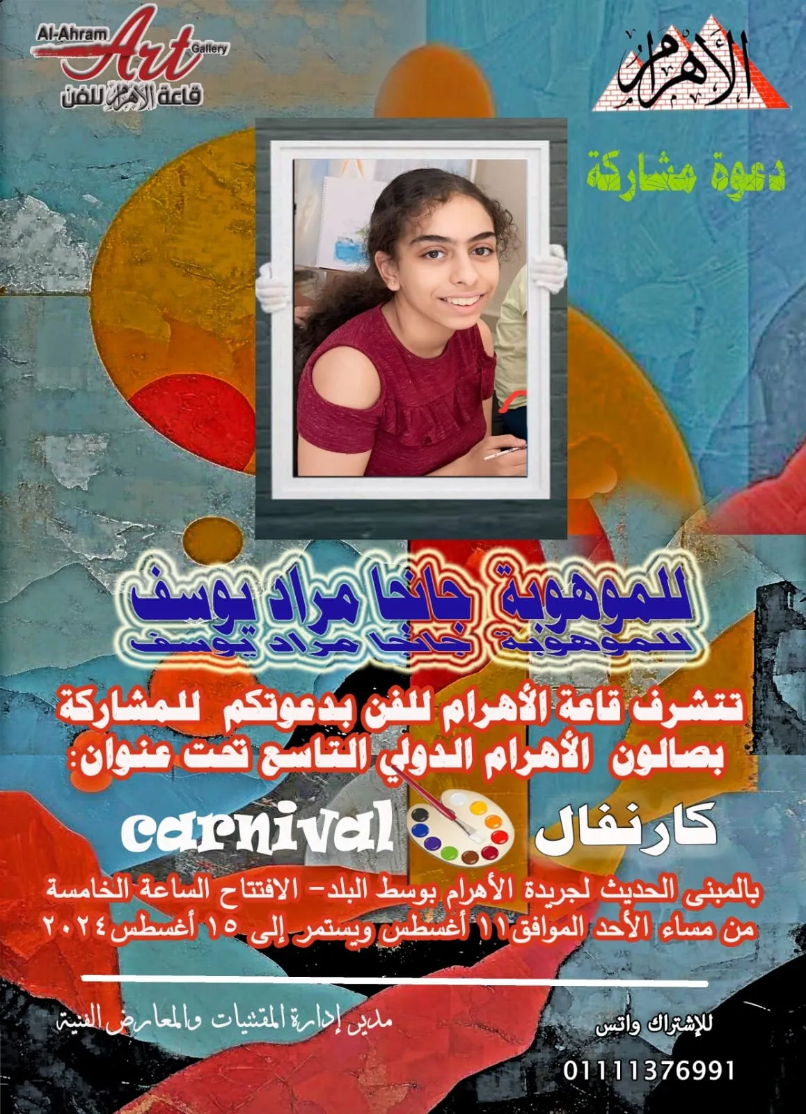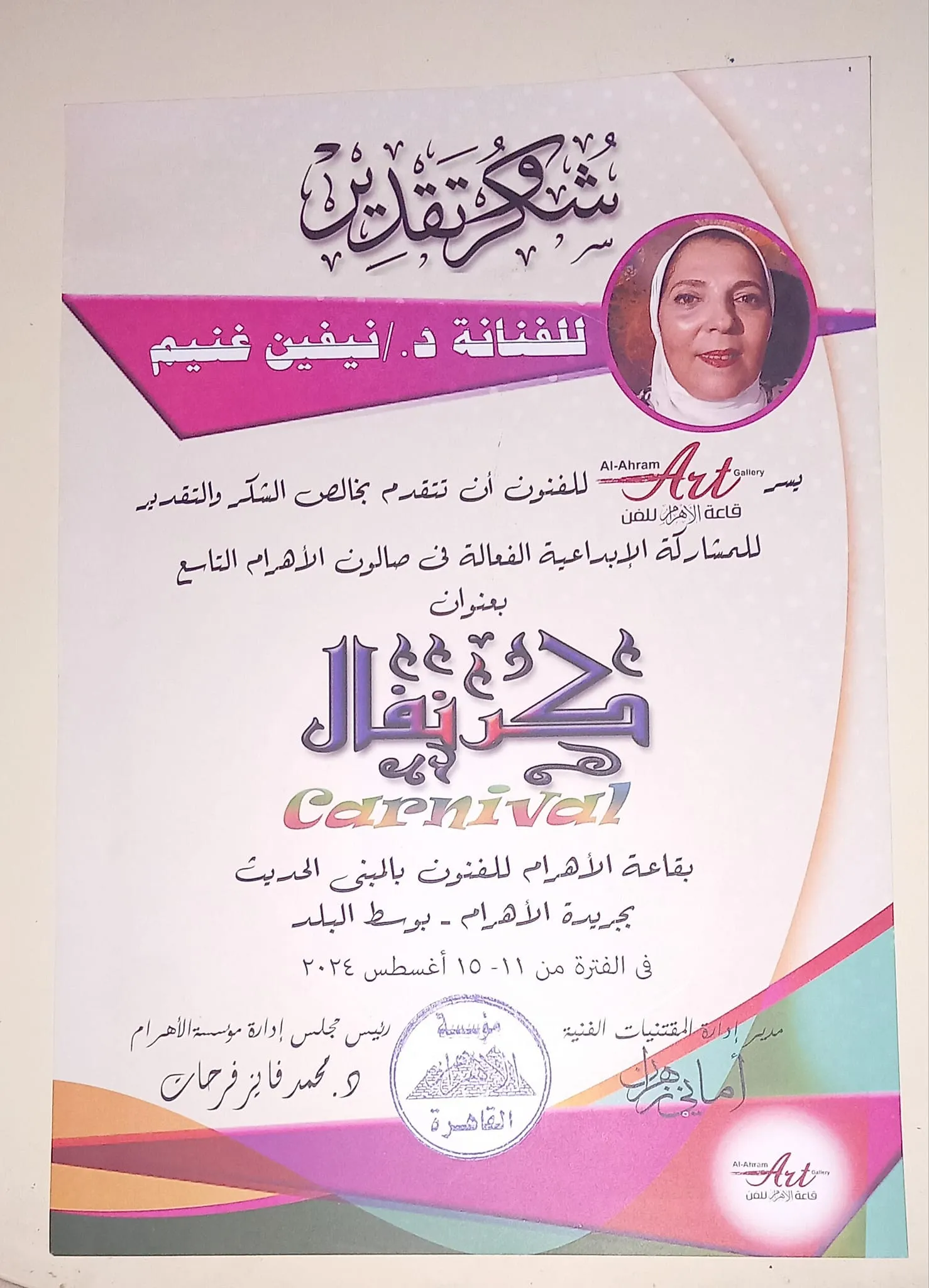 Dr. Hossam Mowafy, Professor of Critical Care Medicine at Kasr El Ainy, Mr. Ahmed Aql, Executive Director of Americana Communications, journalist Ms. Fatima Abu Hatab, Deputy Governor of the Rotary District, and Prof. Ashraf Fathy, Professor of Design and Decoration at the Faculty of Education, Suez Canal University, inaugurated the 9th Al-Ahram International Salon under the title "Carnival" at the Al-Ahram Art Hall at Al-Ahram Foundation. Artist Amani Zahran, Director of the Acquisitions and Art Exhibitions Department and the exhibition commissioner, stated that the carnival is a wonderful color show of various art schools for a group of about 80 artists, both professionals and amateurs, adults, youth and children, from all governorates of Egypt, with Arab participation by a group of brilliant artists, who represented their countries in this artistic event. The exhibition will extend until next Thursday with live art workshops by artists Mohamed Abdel Jalil and Reda Awad, and an art seminar by Dr. Sami El Balshy on art therapy and how to read and produce an artwork, and Dr. Nabila El Khawas on the effect of hot colors on artwork.