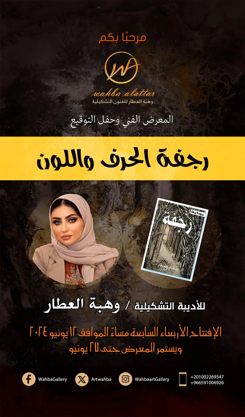 Wehbe Gallery is honored Wahba Gallery Inviting you to the art exhibition The tremor of letter and color By the plastic artist/Wahba Al-Attar Wahba Alattar and Heba Al-Attar for Fine Arts OpeningWednesday , 7 pm, corresponding to June 12, 2024, and the exhibition continues until June 27, Zamalek, 34 Yahya Ibrahim Street, in front of Amoun Private School. +201002269547 +966591006926