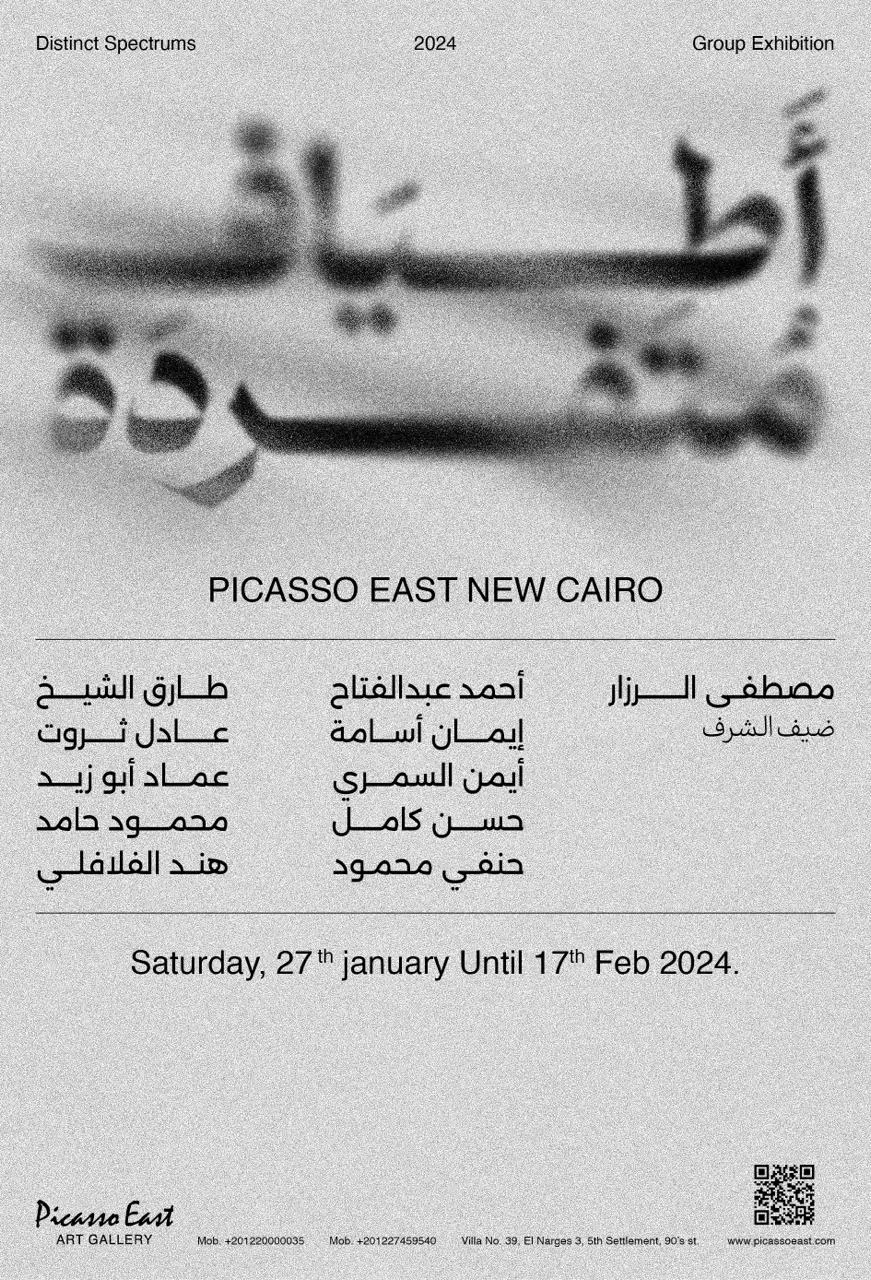 Distinct Spectrums 2024 Group Exhibition Unique spectra PICASSO EAST NEW CAIRO Mustafa Al-Razar, guest of honor Tareq Alshiekh Ahmed Abdel Fattah Iman Osama Ayman Al-Samri Adel Tharwat Imad Abu Zaid Hassan Kamel Hanafi Mahmoud Mahmoud Hamed Hind Al Falafli Saturday, 27th January Until 17th Feb 2024. Picasso East ART Gallery Mob. +201220000035 Mob. +201227458540 Villa No. 30, El Narges 3, Sth Settlement, 90's st www.picessoeast.com