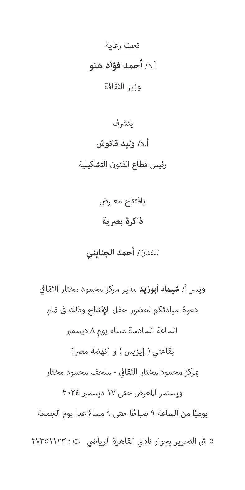 We invite you to attend the opening of the exhibition "Visual Memory" at Mahmoud Mokhtar Cultural Center Under the patronage of Prof. Dr. Ahmed Fouad Hanou, Minister of Culture, Prof. Dr. Walid Qanoush, Head of the Fine Arts Sector, will open the exhibition of the artist Ahmed El-Ganaini entitled "Visual Memory" at 6 pm on Sunday, December 8, 2024, in the halls (Nahdet Misr - Isis) at Mahmoud Mokhtar Cultural Center. The exhibition will continue until December 17, 2024. Don't miss the opportunity to attend the opening and view the exhibition with your families and friends. Entrance is free. Time: Daily from 9 am to 9 pm except Friday. Address: 5 El-Tahrir Street, next to Cairo Sports Club. Tel: 0227351123 #Fine_Arts_Sector Mahmoud Mokhtar Cultural Center
