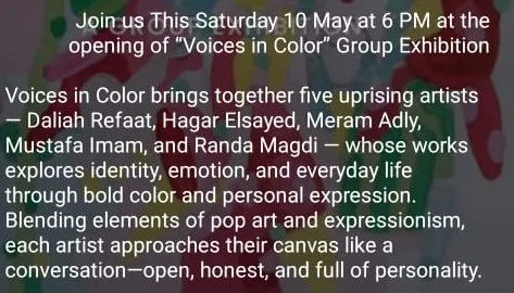 Picasso Art Gallery Join us This Saturday 10 May at 6 PM at the opening of "Voices in Color" Group Exhibition Voices in Color brings together five uprising artists - Daliah Refaat, Hagar Elsayed, Meram Adly, Mustafa Imam, and Randa Magdi - whose works explores identity, emotion, and everyday life through bold color and personal expression. Blending elements of pop art and expressionism, each artist approaches their canvas like a conversation-open, honest, and full of personality.