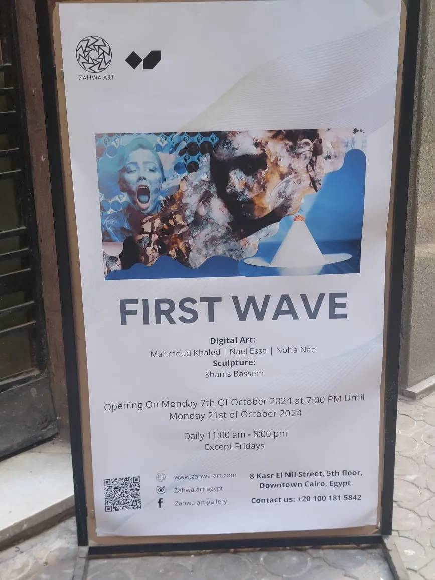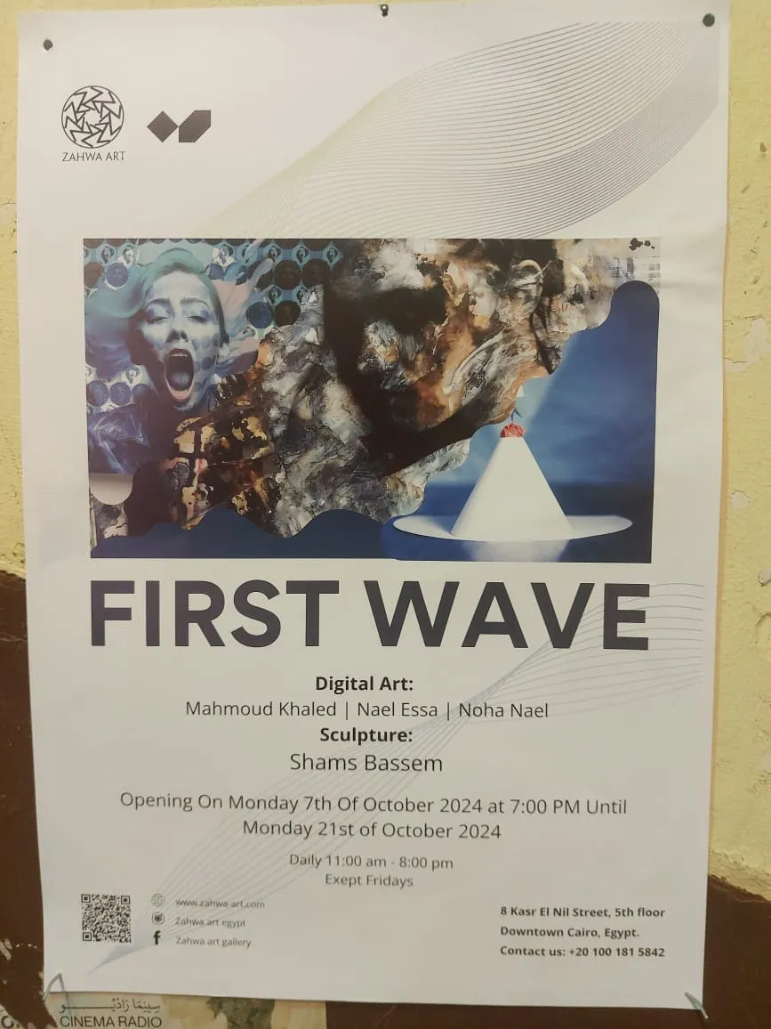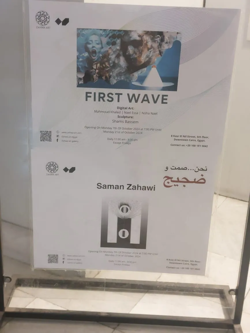 We're thrilled to presentbour 2 upcoming parallel exhibitions: First Wave — a stunning collection featuring digital art and sculpture, alongside (Silence and Noise), a solo exhibition for a star artist Saman Zahawi. Don’t miss out on these exciting exhibitions that push the boundaries of art and creativity! openning 07october at 07 : pm until 21 october 2024 Zahwa Art Gallery, inside Onespace, 8 Kasr El Nil Street, 5th floor, Downtown Cairo. Open daily from 11:00 AM to 8:00 PM.