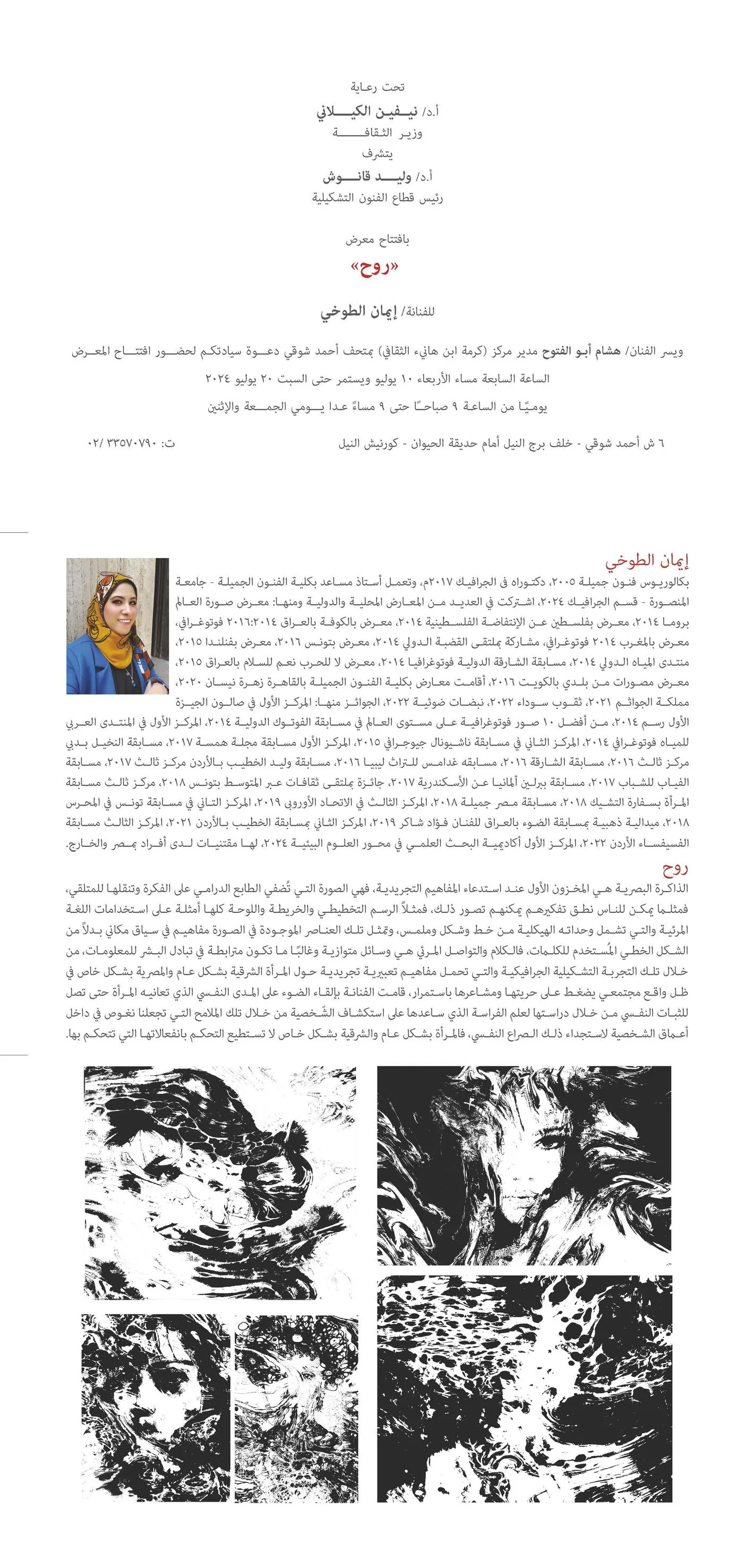 (spirit) At the Karma Bin Hani Cultural Center Under the patronage of Prof. Dr. Ahmed Fouad Hanno, Minister of Culture, Prof. Dr. Walid Qanoush, Head of the Fine Arts Sector, kindly opened the artist Iman Al-Toukhi’s exhibition under the title (Spirit), at exactly 7 pm on Wednesday, July 10, 2024, at the Karma Bin Hani Center. Cultural Museum, Ahmed Shawky. The exhibition runs until July 20, 2024. Timings: Daily from 9 am to 9 pm, except for Friday and Monday. Address: 6 Ahmed Shawky Street - behind the Nile Tower in front of the Zoo - Nile Corniche in Giza. Tel: 0235707960 Waiting to honor you #Fine_Arts_Sector