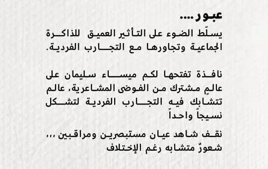 Noura Binsaidan Studio 19 - 23 December 2024 19-23 December 2024 Highlights the profound impact of collective memory and its juxtaposition with individual experiences. A window opened for you by Maysa Suleiman to a shared world of emotional chaos, a world in which individual experiences intertwine to form a single fabric We stand as eyewitnesses, discerning observers, and observers.... A similar feeling despite the difference