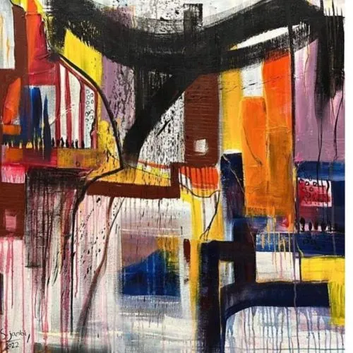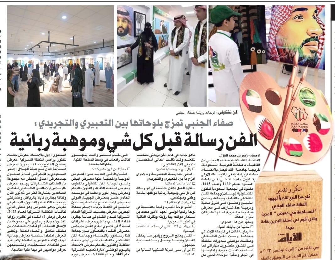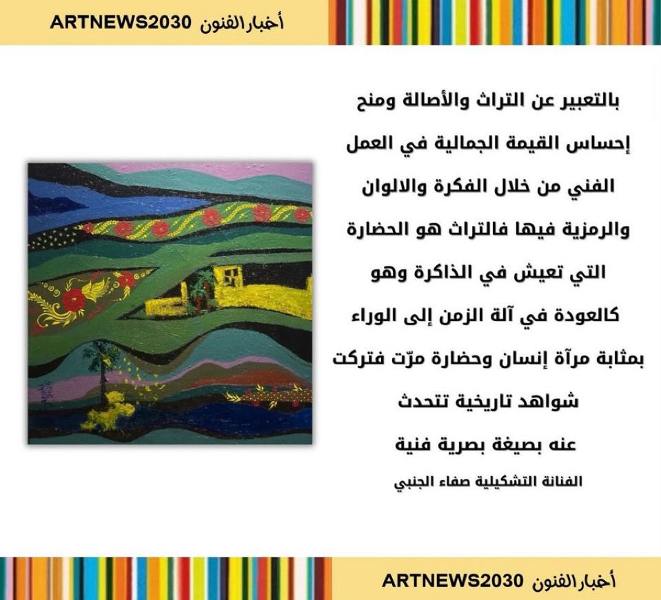 Safaa Hassan Ali Al-Janabi is a visual artist from Qatif, a graduate of King Faisal University in Al-Ahsa, an art teacher in the first intermediate school in Tarout and a recipient of the Distinguished Teacher Award at the Qatif Education Office for the years 1439 and 1445, a member of the Saudi Society for Fine Arts (JSFAT), the Fine Arts Group in Qatif, and the Gulf Painters Group, and a member of several local and Arab teams. I have taken various and diverse art courses, so my skills have developed by studying all types of arts and using new techniques and practicing them in completing and implementing paintings. I have participated in many group art exhibitions, and I have also participated outside the Kingdom, and my works have been appreciated by connoisseurs of visual art. Art, for me, is a divine message and talent, as it treats the soul, shows what is inside the artist, and expresses his idea. I also belong to the expressionist school, and rather I mix between expressionism and abstraction.