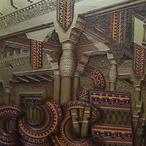 Uniqueness and special feature is what distinguishes the works of the plastic artist Abdul Mohsen Aba Hussein. He relies on the accuracy of transfer and documentation of decoration from its sources and transforming it into artistic paintings, and perhaps that was the reason behind some people believing that his works are repetitive, but reality proves otherwise, as he traveled a lot to a number of cities and villages in "Najd" and took hundreds of pictures of everything old in the field of building and decorating doors and houses, and visited a number of elderly people who were professional door engravers, including the late artist Ali Al-Naqeedan, and researched a lot with them about this decoration, until he reached his own distinctive style.