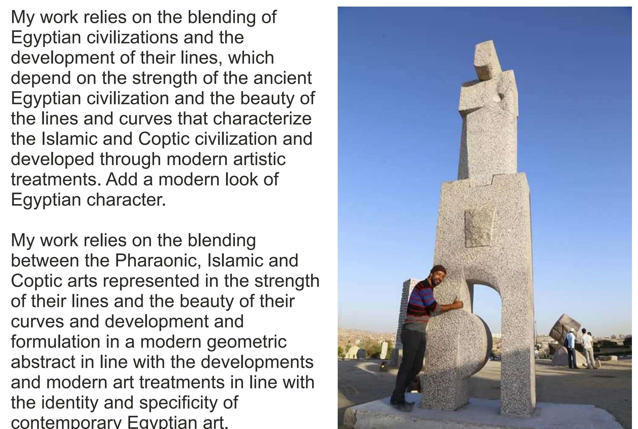 My work relies on the blending between the Pharaonic, Islamic and Coptic arts represented in the strength of their lines and the beauty of their curves and development and formulation in a modern geometric abstract in line with the developments and modern art treatments in line with the identity and specificity of contemporary Egyptian art.